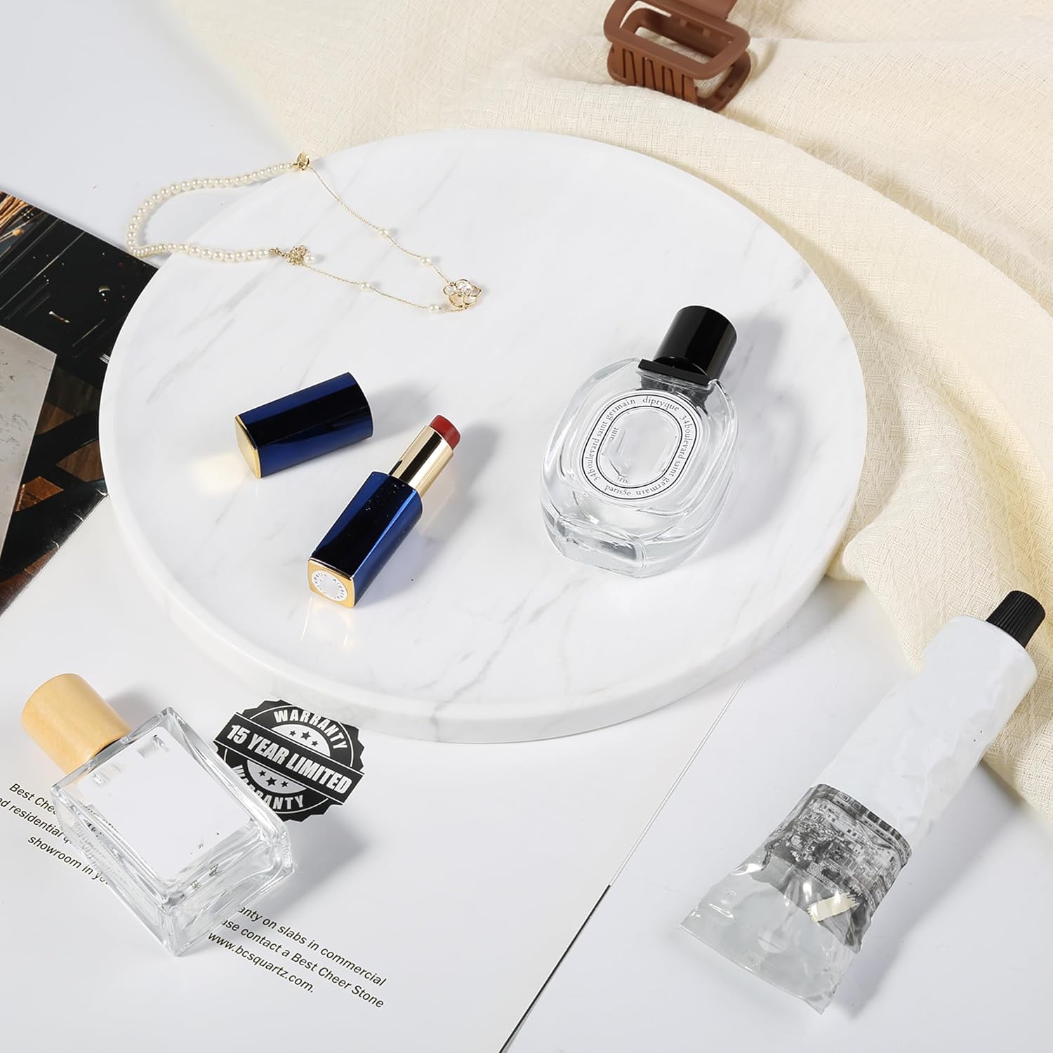 - Suitable Size: Our small round marble tray measures D9.8โx H0.7โ. This bathroom counter tray fits bathroom washstands, kitchen counters, coffee tables, bedroom dressers, vanity tops, and bedside tablesโideal for organizing and enhancing your space