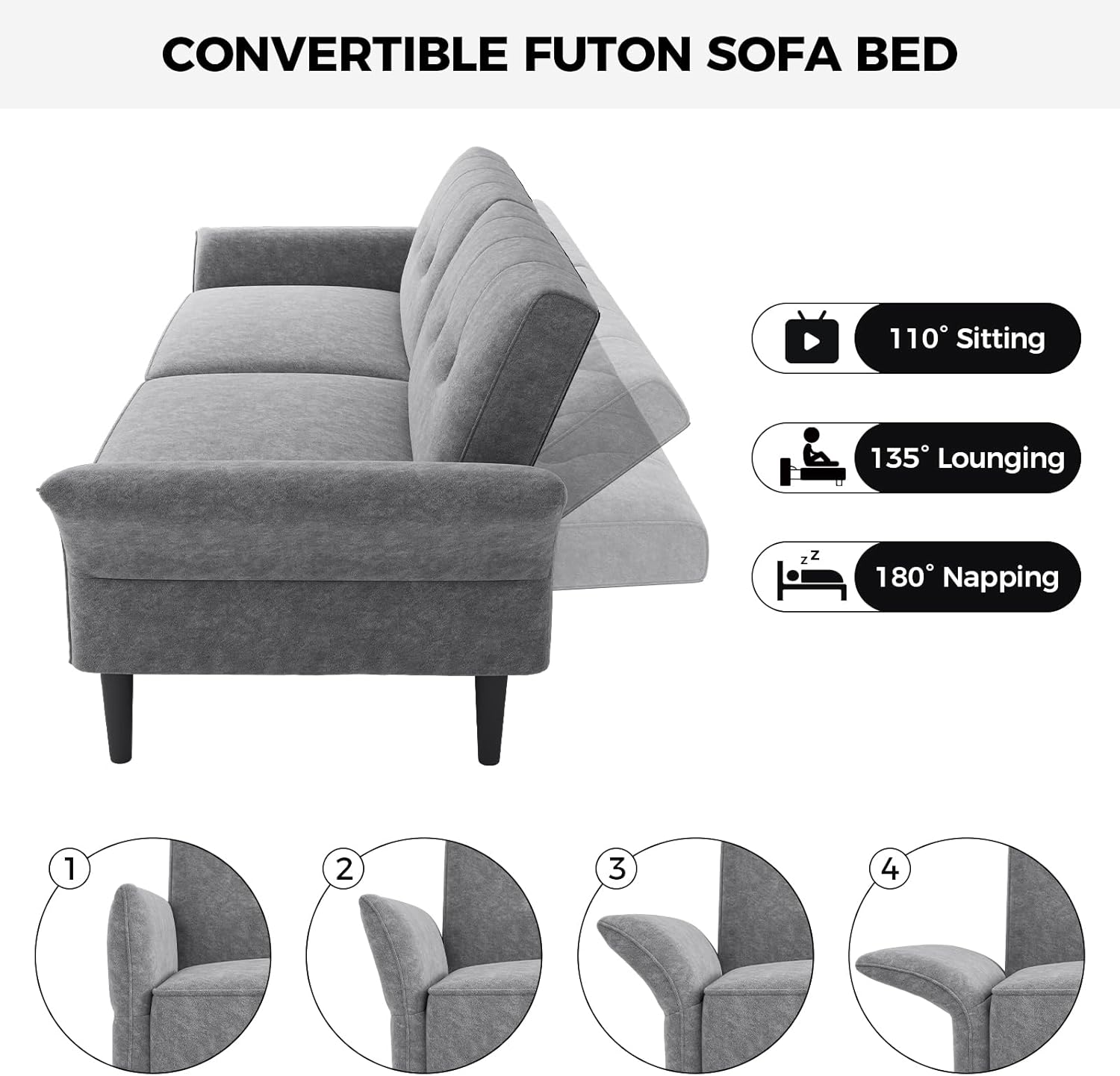 - 【Four-position Adjustable Armrests】Designed in popular styles, this convertible sofa bed is a perfect blend of style and durability. The armrests on both sides can be deployed outward for maximum side lying area, and the maximum deployment angle can be up to 90°. Meanwhile, with the two soft report pillows provided, you can place the pillows at the cervical vertebrae and lumbar region to effectively relieve fatigue