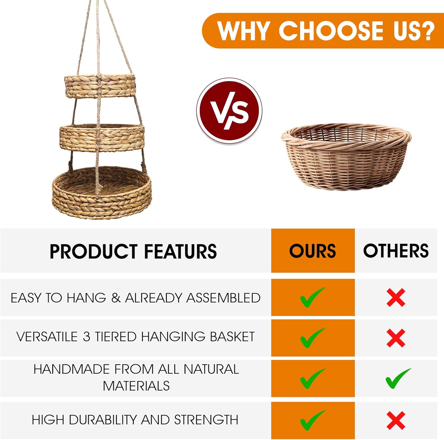 - Versatile Hanging Basket: Set of 3 woven baskets designed for hanging storage of fruits, vegetables, kitchen supplies, and more.