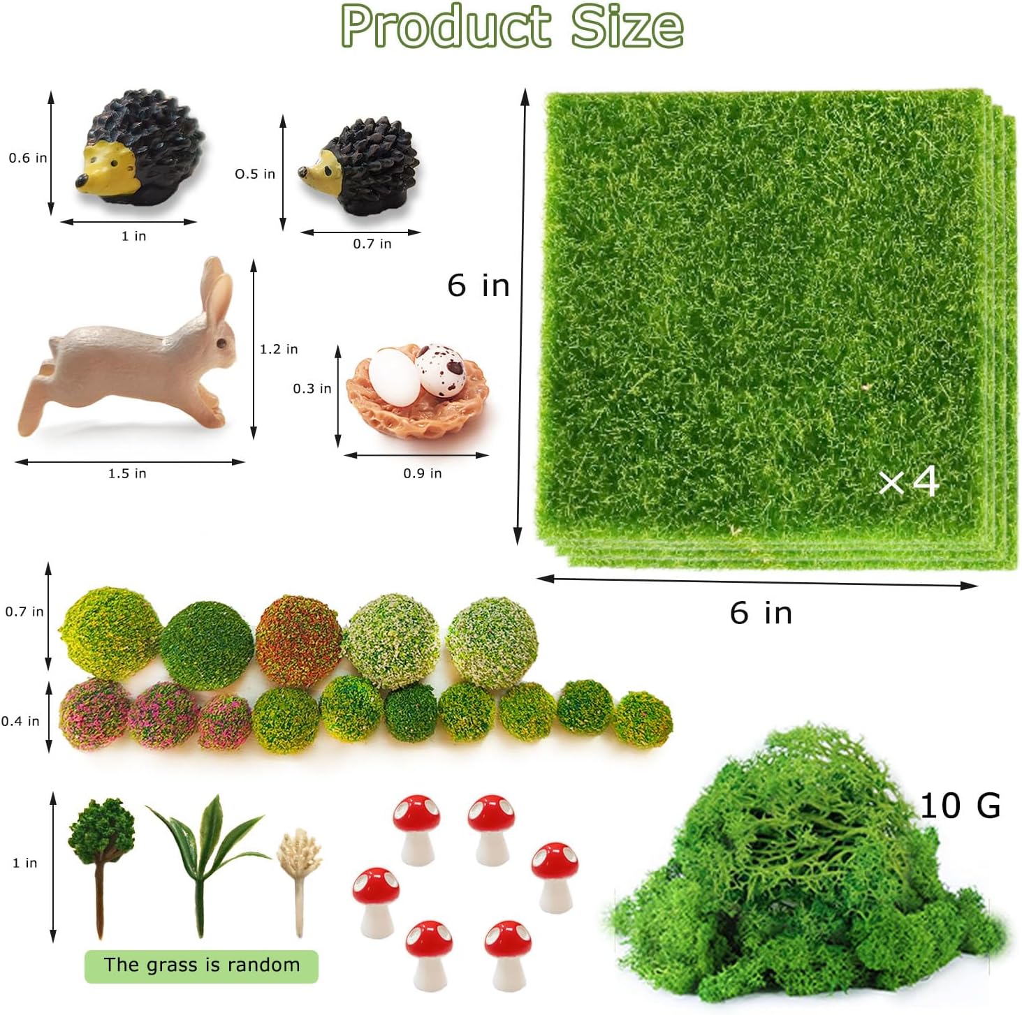 - Content:You can receive a total of 36 pieces from this mini garden grass set, containing 4 pieces of artificial dollhouse fairy garden grass, a pack of grass balls, fake moss, miniature garden figurines with hedgehogs, rabbits, and small mushroomsοΌtree and more