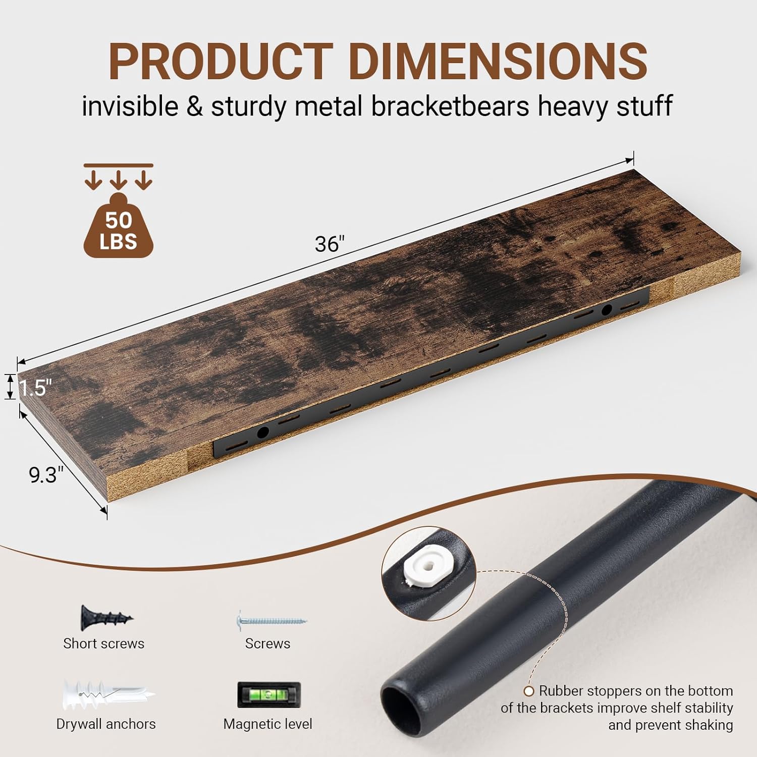 - γSturdy & Reliable MaterialγThe brown floating shelves use metal brackets and screws to be firmly fixed to the wall without sagging.Our rustic brown floating shelves 36 inch are made of high quality MDF material,can hold up to 50 lbs to safely place your items.