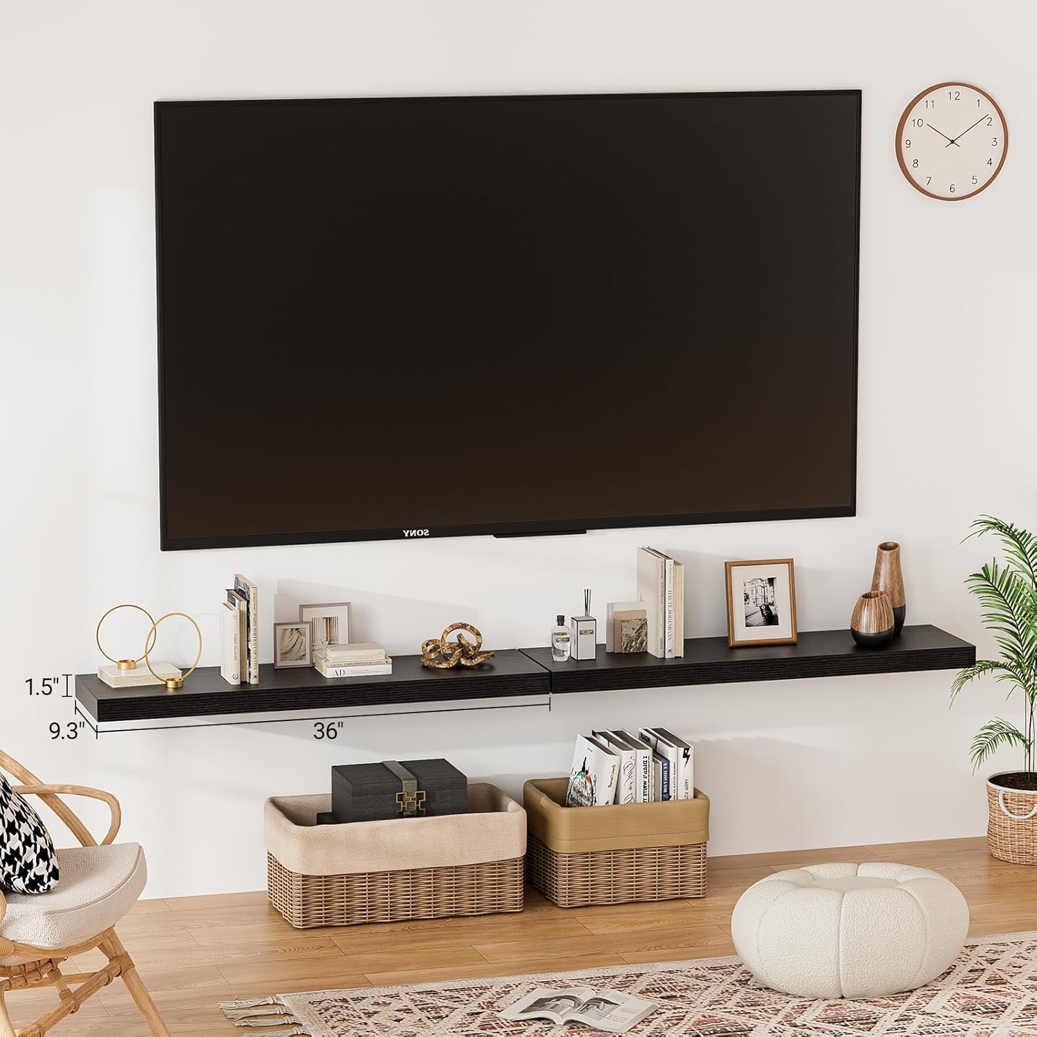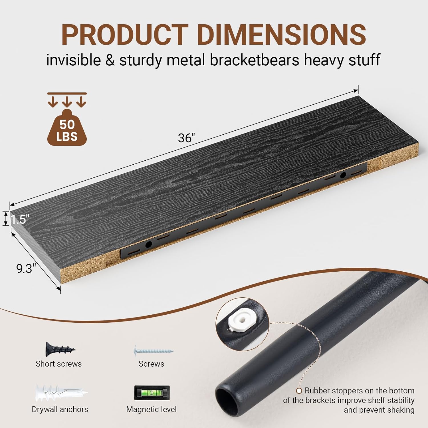 - γLonger DesignγOur pretty 36 inch wall shelves are 36"W x 9.3"D x 1.5"H.Our black shelves for wall is longer than traditional designs and can hold more items.The 36 inch floating shelf optimize wall space,helping organize essentials without taking up floor space in your home.