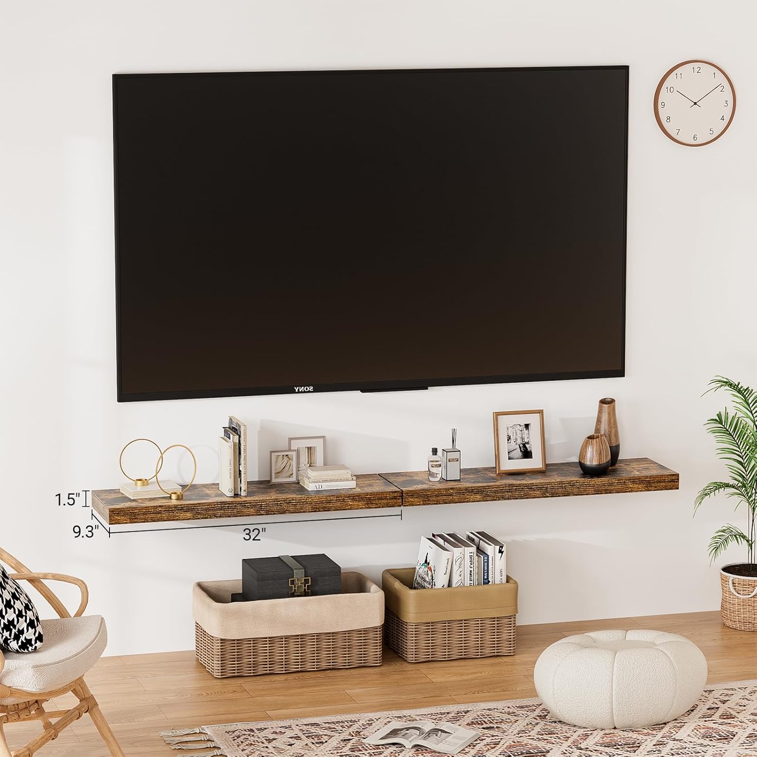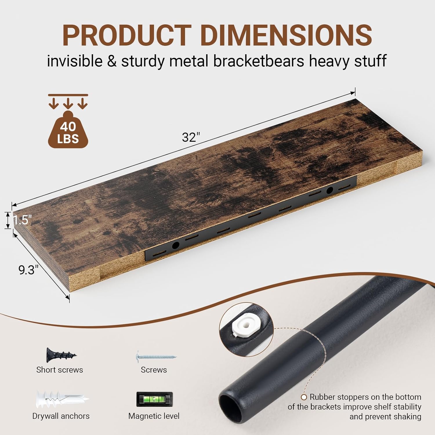 - γLonger DesignγOur pretty rustic brown floating shelves are 32"W x 9.3"D x 1.5"H.Our 32 floating shelves is longer than traditional designs and can hold more items.The brown floating shelves optimize wall space,helping organize essentials without taking up floor space in your home.