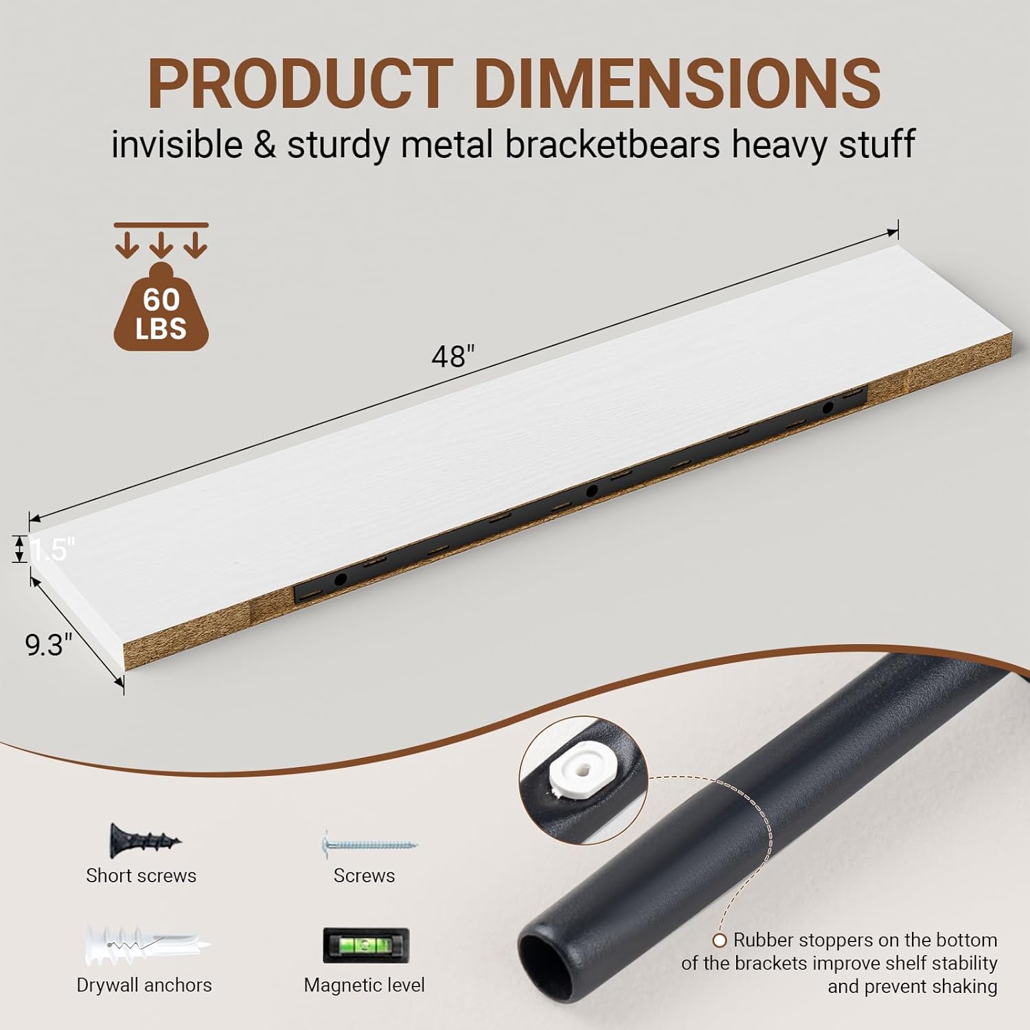 - 【Longer Design】Our pretty white floating shelves for wall are 48"W x 9.3"D x 1.5"H.Our wall shelf is longer than traditional designs and can hold more items.The white floating shelf optimize wall space,helping organize essentials without taking up floor space in your home.