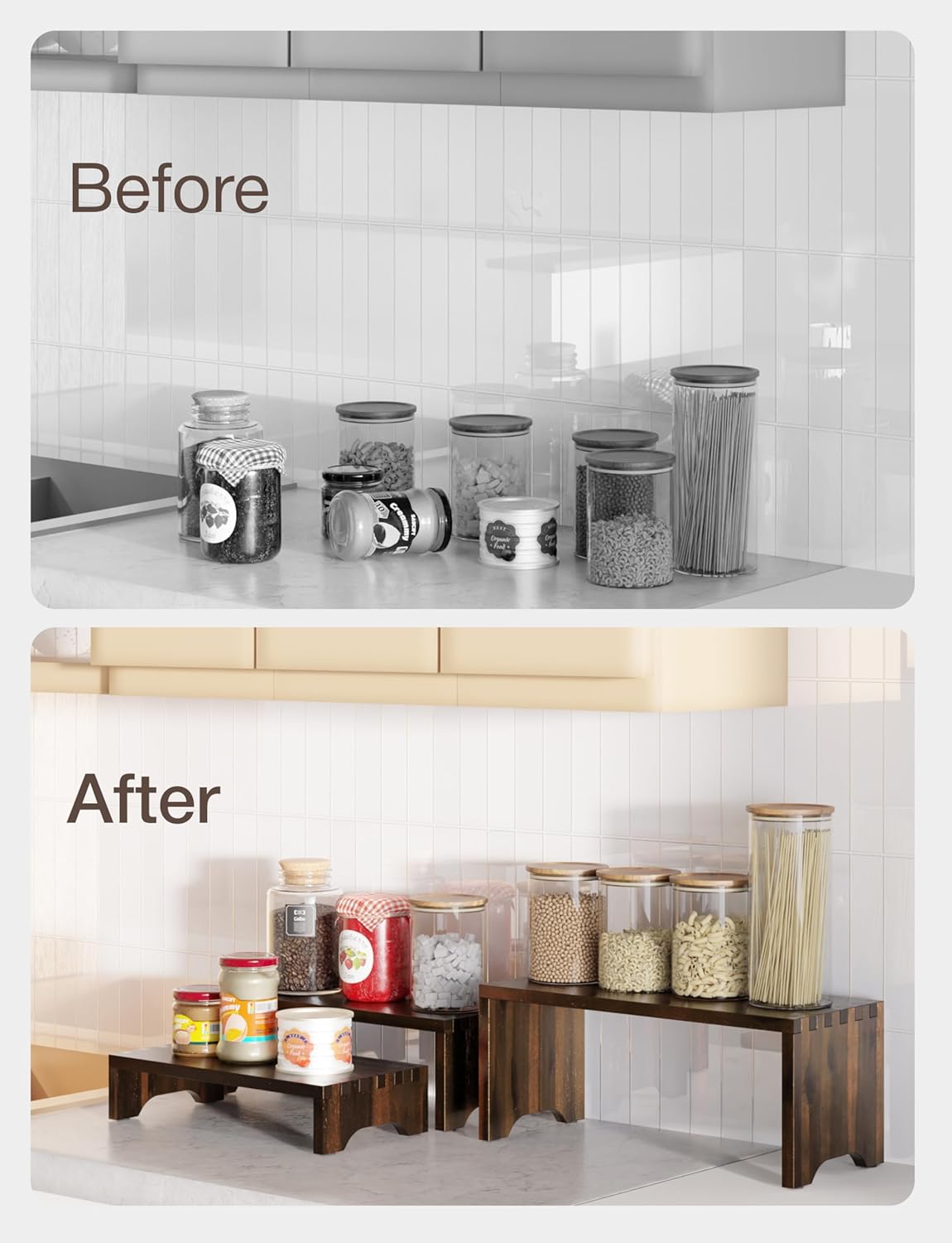 - Set of 3 Sizes: This wood risers display stands set include three different size 16.5", 15", and 13.4" in length. These food risers for buffet table can be used individually or nested together, offering flexible height options for tiered dessert presentation, countertop organization or buffet risers and stands