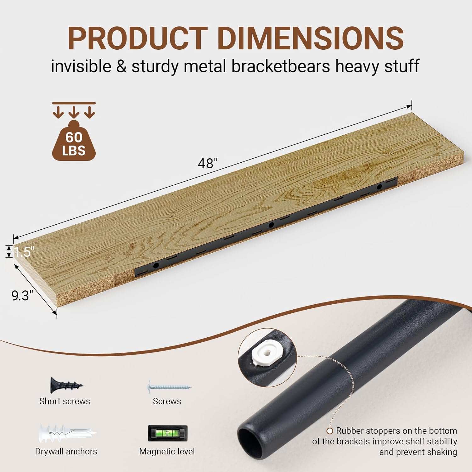 Heimlove Floating Shelves for Wall 48 Inches Long,9.3" Deep Oak Floating Shelf Set of 2,Wall Mounted Wood Shelves for Bathroom Bedroom Living Room Kitchen Office,Shelf for Books Storage Room Decor