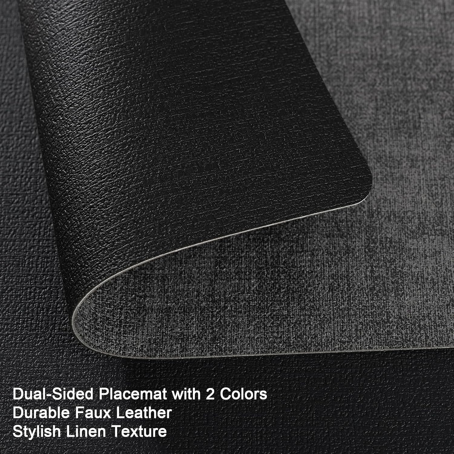 - These placemats are made of faux leather, the sufface texture imitate the linen. Unlike woven or fabric placemats, these placemats are water resistant, they can block the sauce or any liquids to protect the desktop.