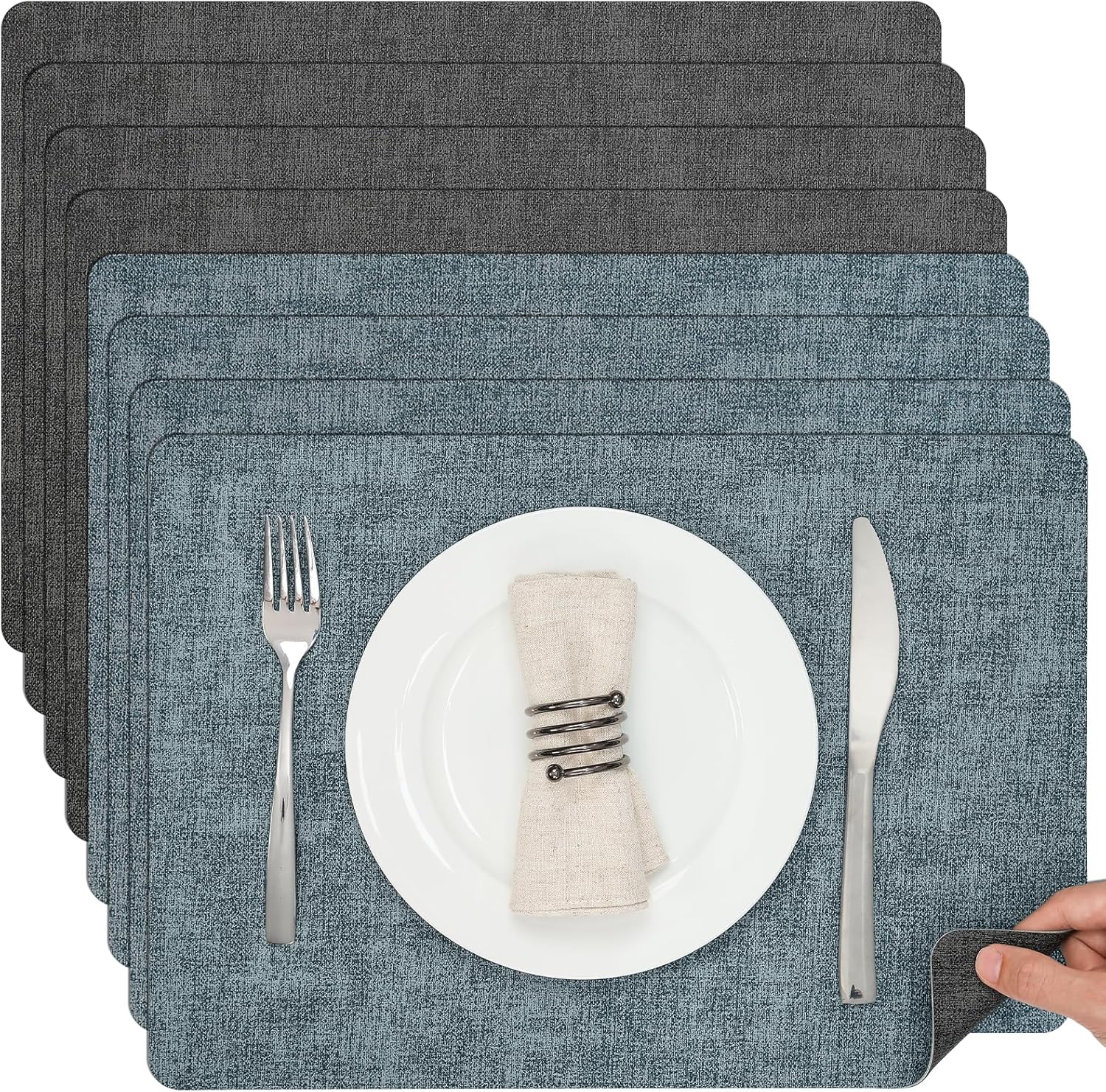 Myir JUN Dual Sided Placemats, Faux Leather Set of 8 for Dining Table, Non-Slip Washable Heat Resistant Indoor Outdoor Table Mats (Gray Light Blue)