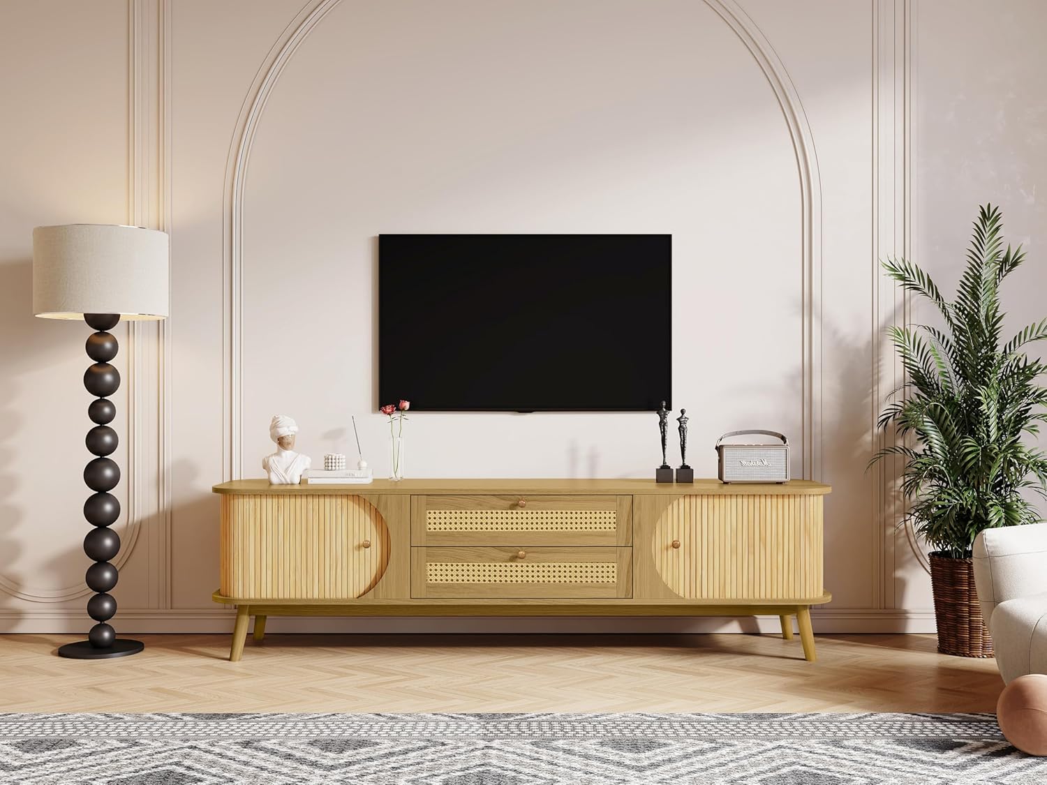 Merax Modern Fluted TV Stand for 75" TVs, Mid-Century Entertainment Center Tambour Door Media Console TV Cabinet with Rattan-Front Drawer for Living Room, Curved Profile Design