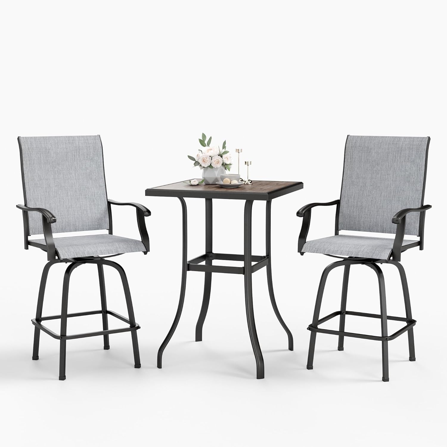 - 【Bar-height Patio Table and Chairs】Combines ergonomic high back design with seamless swivel functionality, this bar set provides a stylish and elevated seating option that adds flair to any space. Patio bar table features elegant wood-like table top