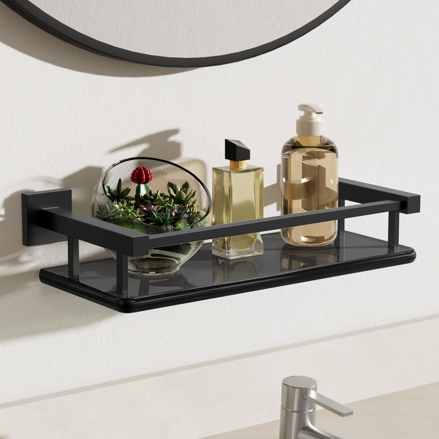 - CLEAR VIEW:The transparent glass of our floating shelves for bathroom allows you to showcase your items while keeping your space looking uncluttered and open