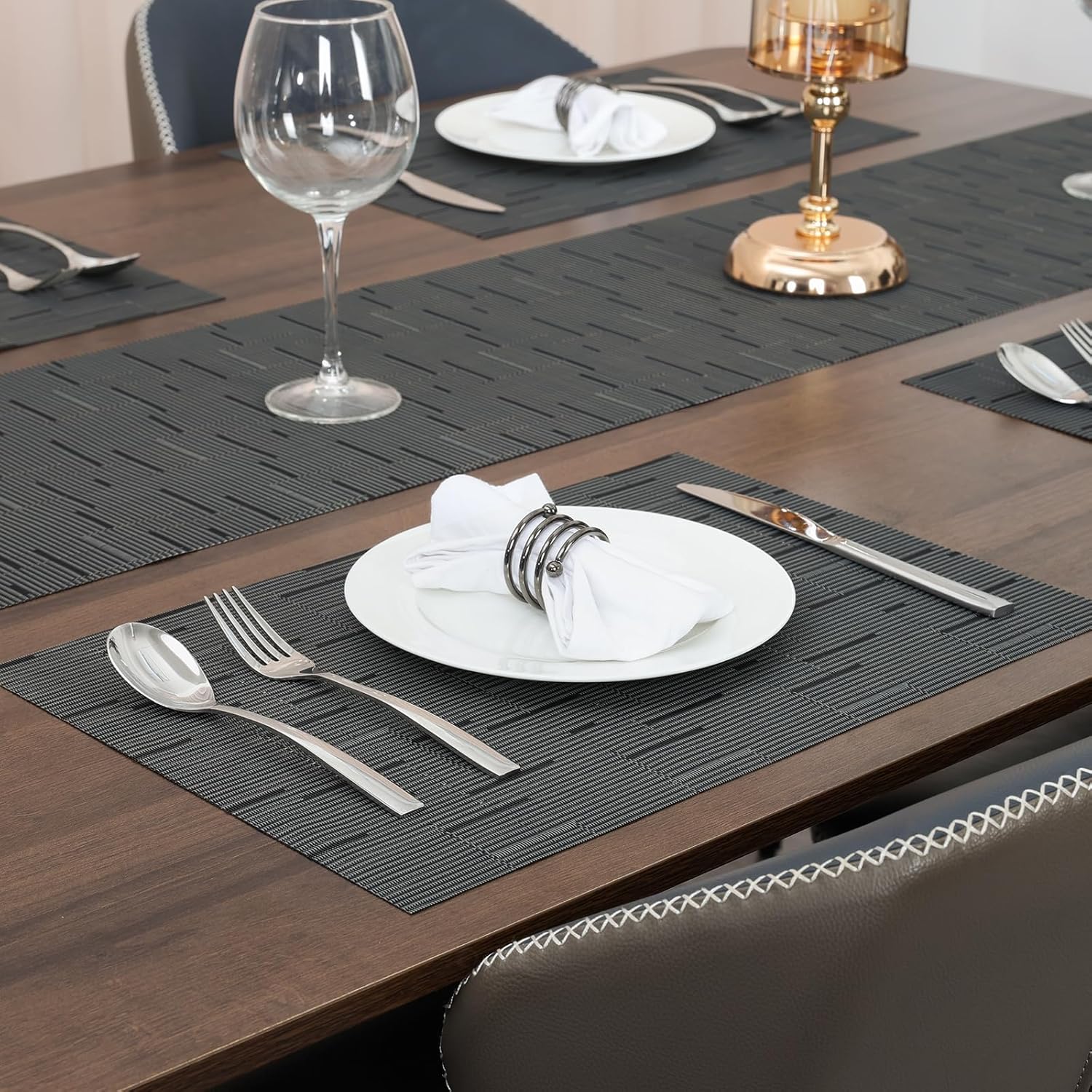 Myir JUN Placemats Set of 4, Vinyl Woven Placemats Place Mats Indoor Set of 4 Washable Table Mats Non-Slip Place mats for Dining Table (Black-Gray, Set of 4)