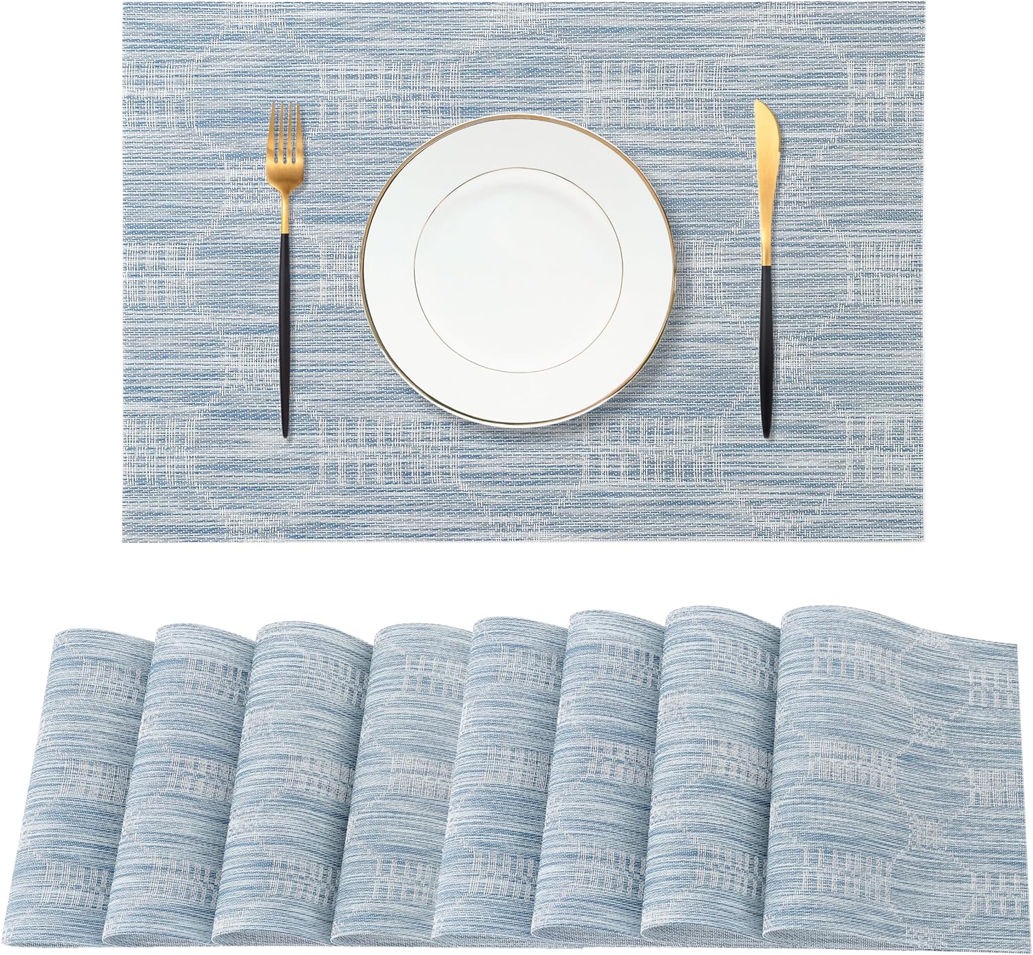 Leetaltree Jacquard Blue Placemats Set of 8 - Heat Resistant Non-Slip Place mats for Dining Table, Washable Durable PVC Vinyl Woven Table Mats(Jacquard Blue, 8)