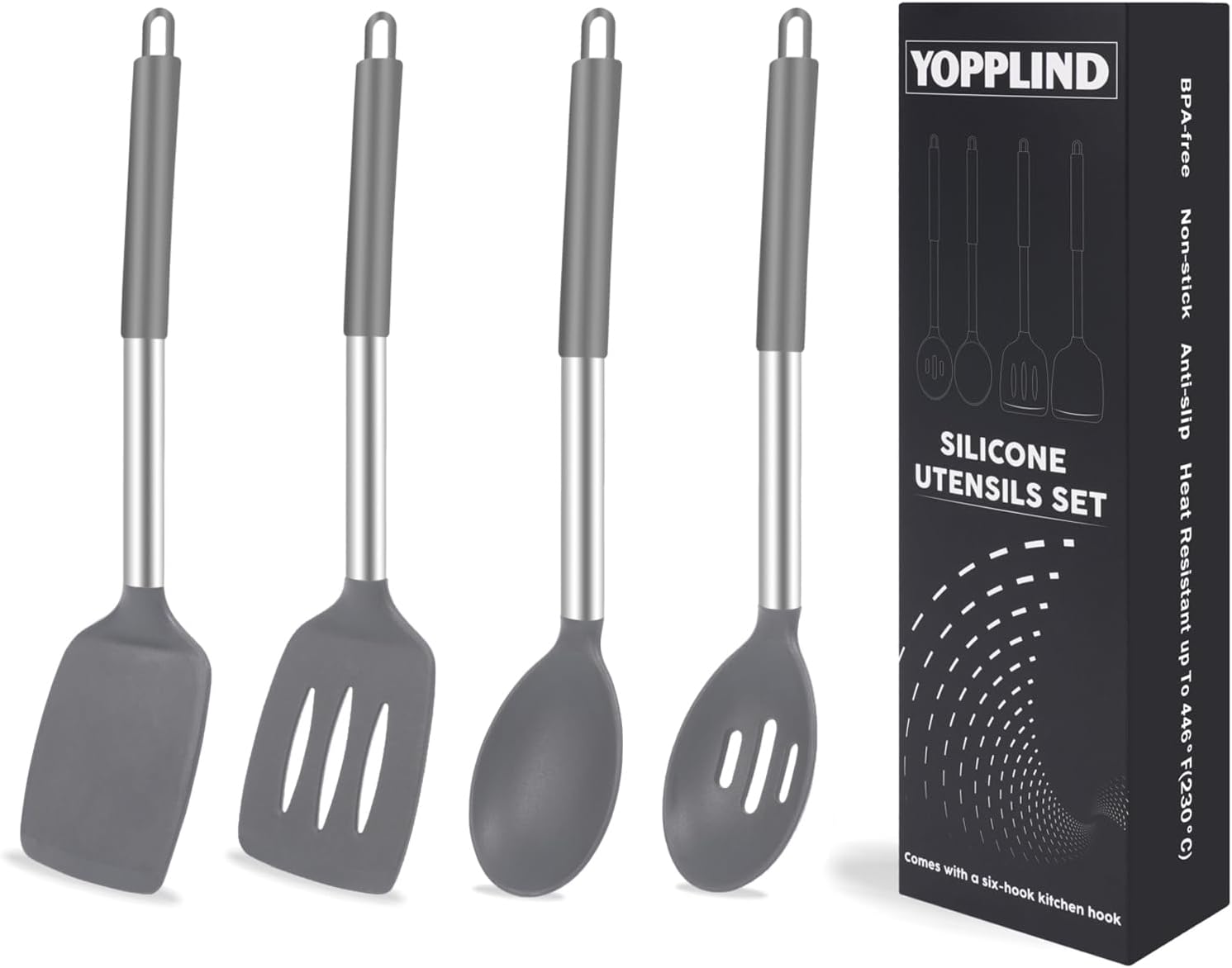 5-Piece Silicone Kitchen Tool Set, BPA-Free, Heat-Resistant, Non-Stick & Dishwasher-Safe, with Slotted/Solid Spoons & Spatulas for Frying, Mixing, Draining – Includes Multi-Purpose Serving Hook(Gray)