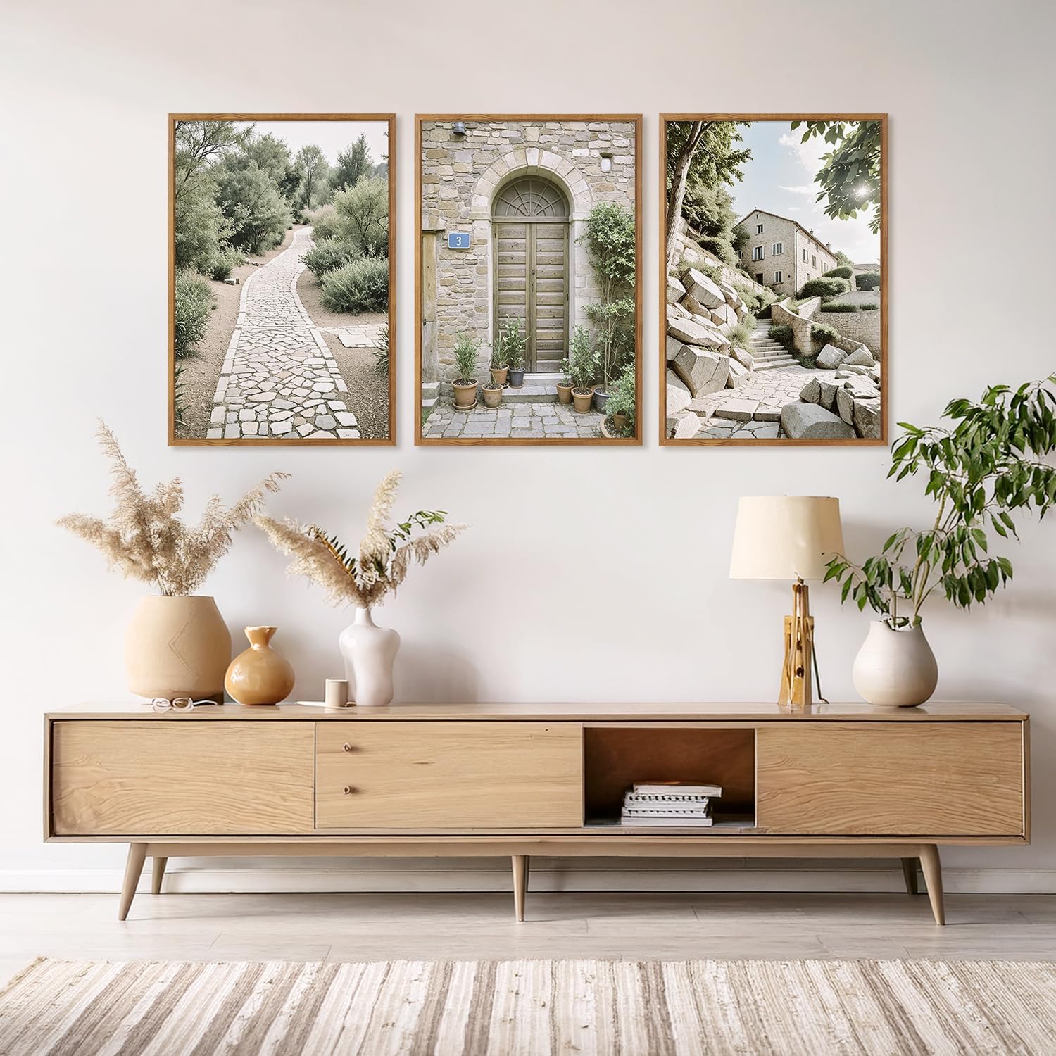 - Neutral Italy Countryside Wall Decor-- Aurlan boho landscape canvas artwork is a 3-piece wall art of the scenery along the Mediterranean coast, featuring ancient architecture, green trees, and distant seascapes. It collectively creates a tranquil and beautiful Mediterranean ambiance.