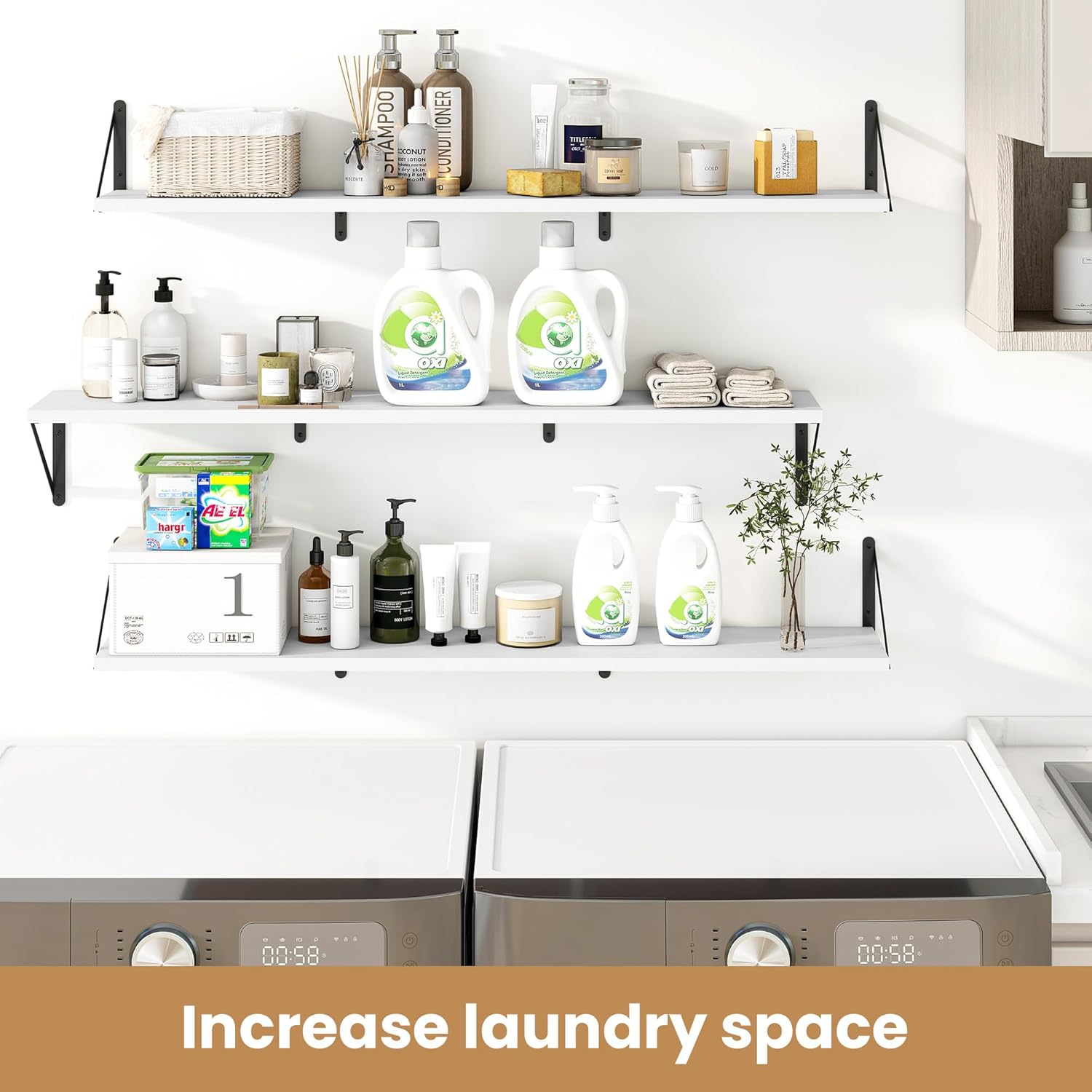 - 【Sturdy and Durable】The wall-mounted shelves are sturdy enough,with two load-bearing metal frame added in the middle,which will not deform and can withstand a weight of 50 pounds. It is very suitable for use as a wide bookshelf,TV stand,for home office,laundry room. Follow the instruction steps,including all necessary hardware,easy to assemble.