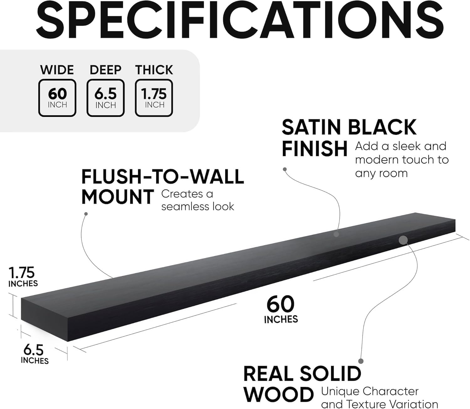 - AUTHENTIC WOOD GRAIN - Enjoy the timeless elegance of real wood. Handcrafted from the finest 1.75" Thick natural pine wood measuring 60" Wide x 6.5" Deep x 1.75". Our shelves highlight the inherent charm and durability of high-quality wood. Each Shelf reveals its unique character of knots and natural wood grain; each ledge is a little different but equally stunning.