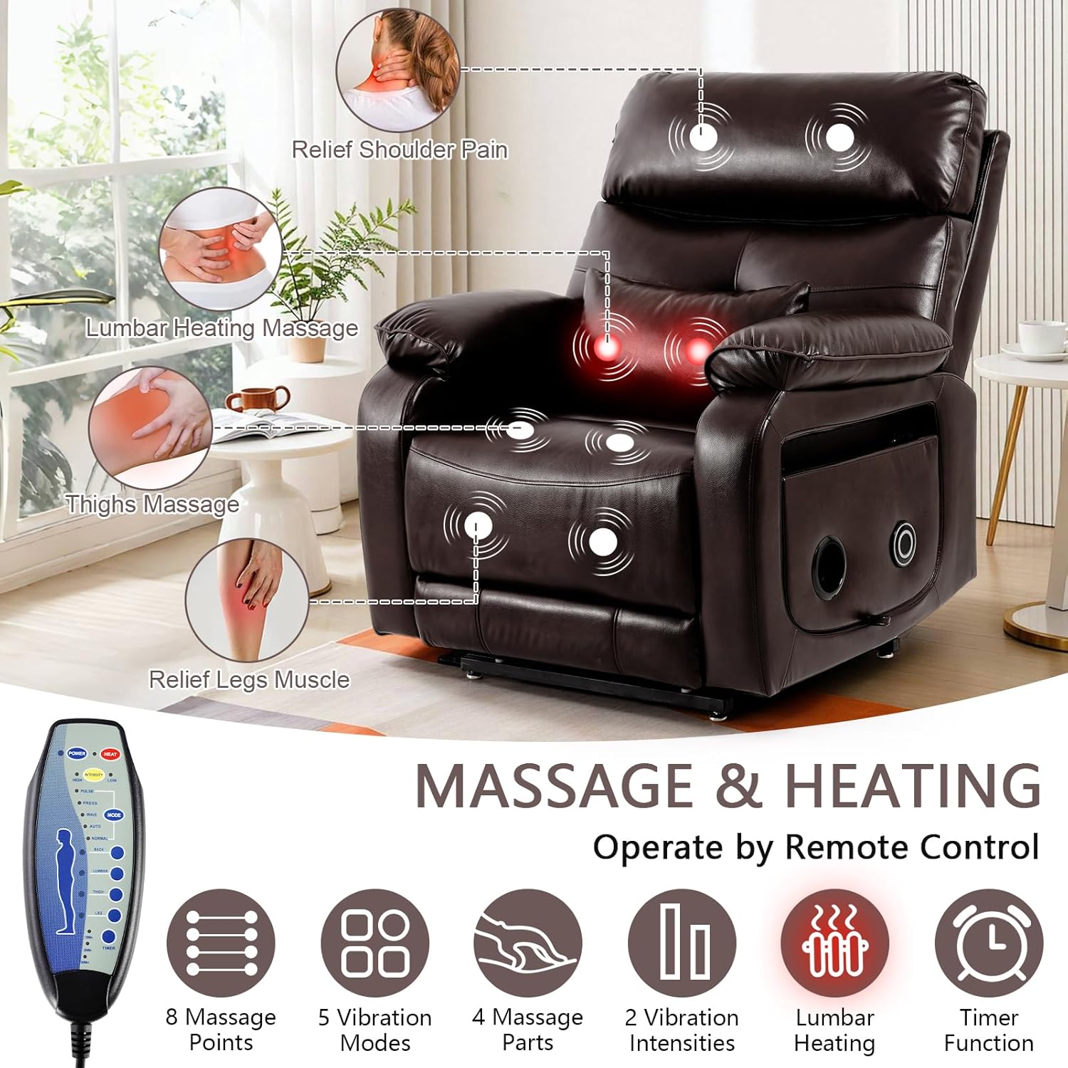 - γMassage & Lumbar HeatingγEight massage points are distributed across the back, waist, thighs, and legs, with five massage modes and adjustable vibration intensity for a fully customizable experience. The lumbar heating function improves circulation and relieves waist pressure, making it perfect for anyone looking for a heated lift chair or massage recliner chair