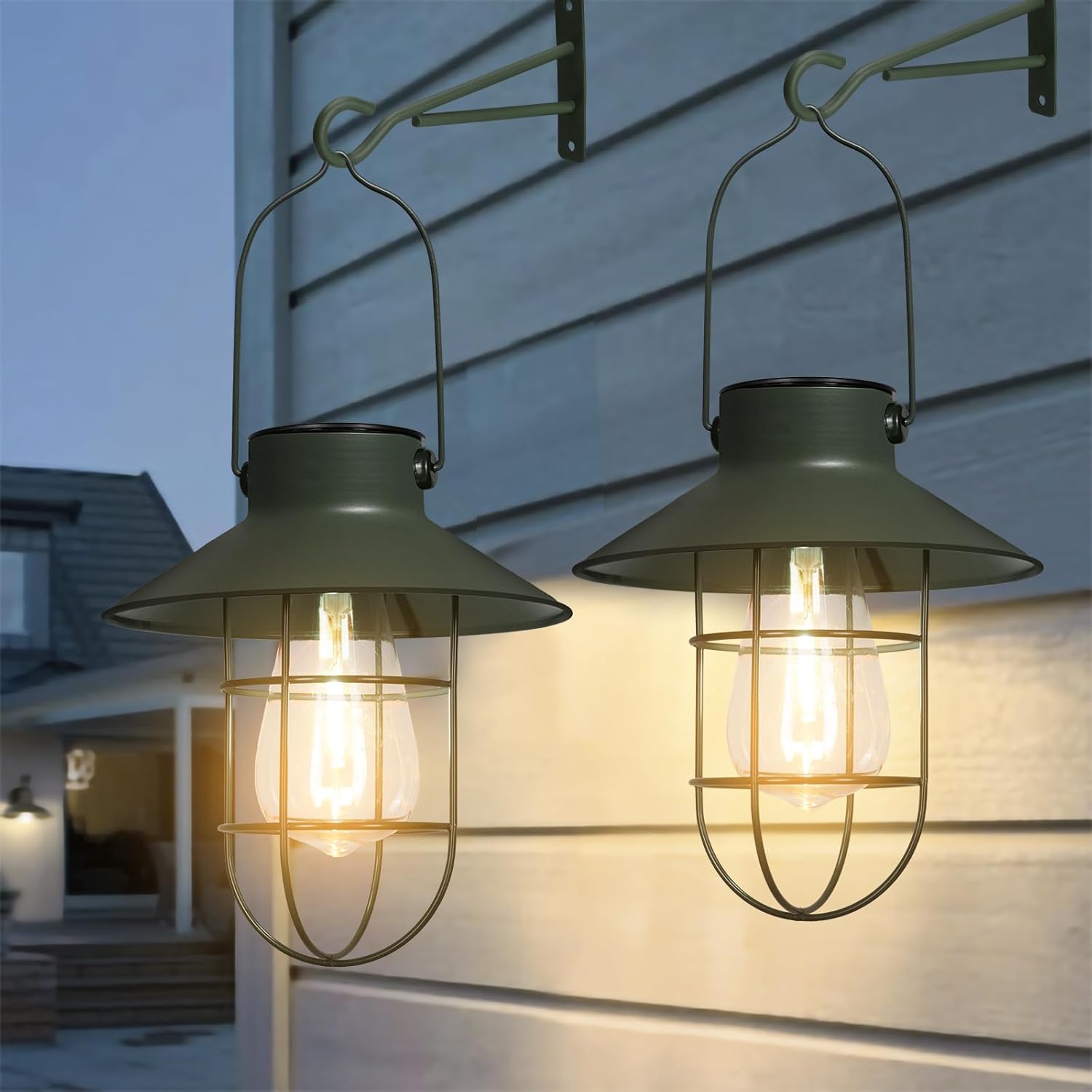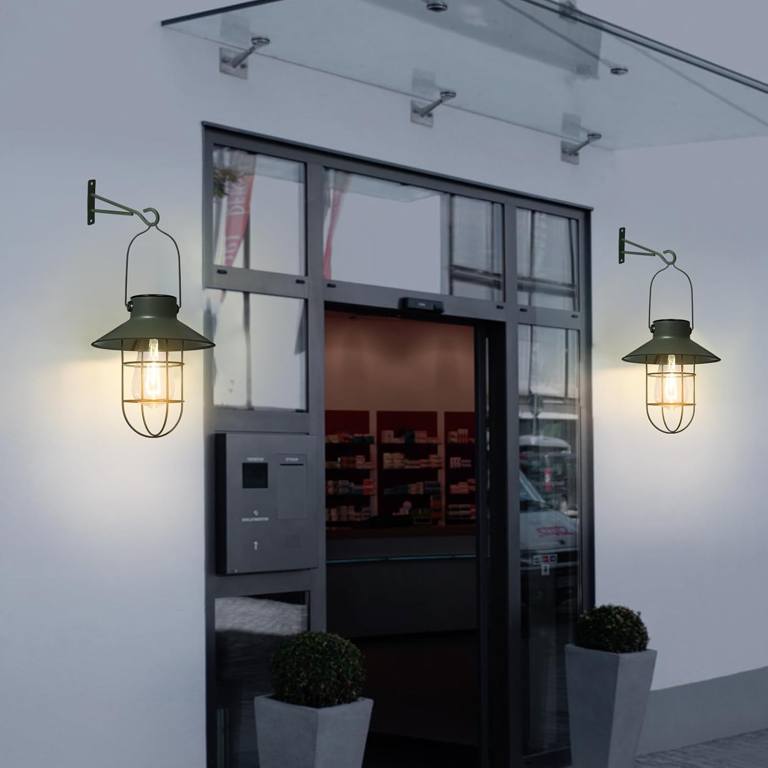 pearlstar Solar Lanterns Outdoor Metal Solar Powered Hanging Lights Waterproof for Wall Barn Yard Garden Patio Garage Balcony Porch Fence Decor, Warm White Edison Bulb (Green-2pack)