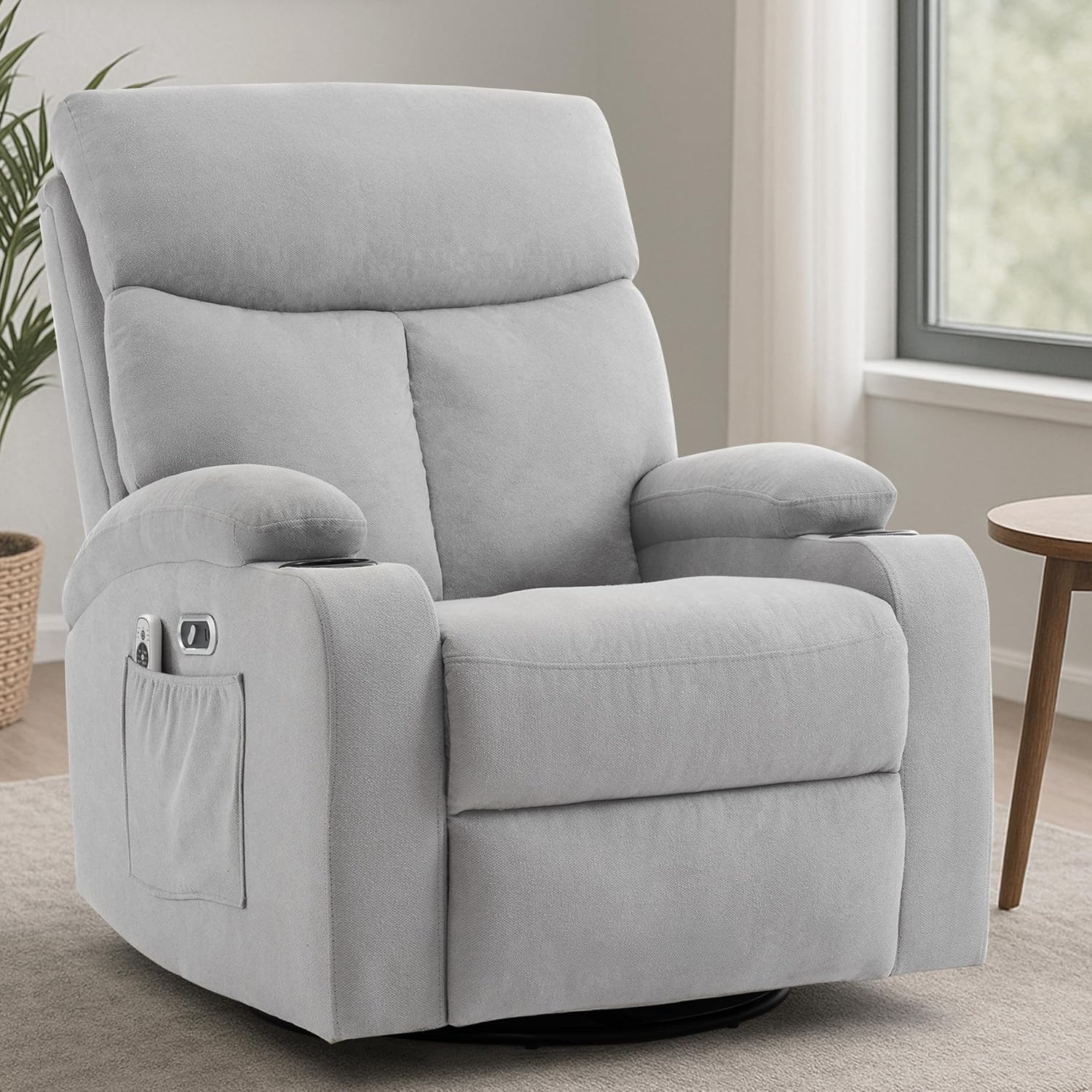 Swivel Power Recliner Chair for Adults with Full Body Massage, Electric Rocker Recliner Chairs for Living Room with USB and Type-C Ports, Fabric Rocking Reclining Sofa Chair (LightGrey)
