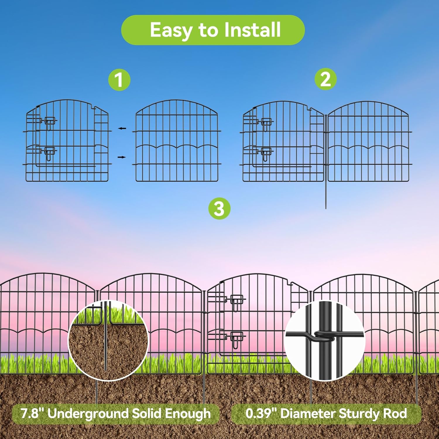 - Fence Size: Each garden fence panel measures 24"W x 24"H with a 1.45" gap, while the 13 metal stakes are 0.39" in diameter and 27.6" tall (7.8" into the soil) for secure anchoring in the ground. The removable fence includes 11 panels + 1 gate, connecting 12 panels, with a total length of 24 ft. The no-digging fence can be added or removed freely, giving you complete flexibility to customize your area.