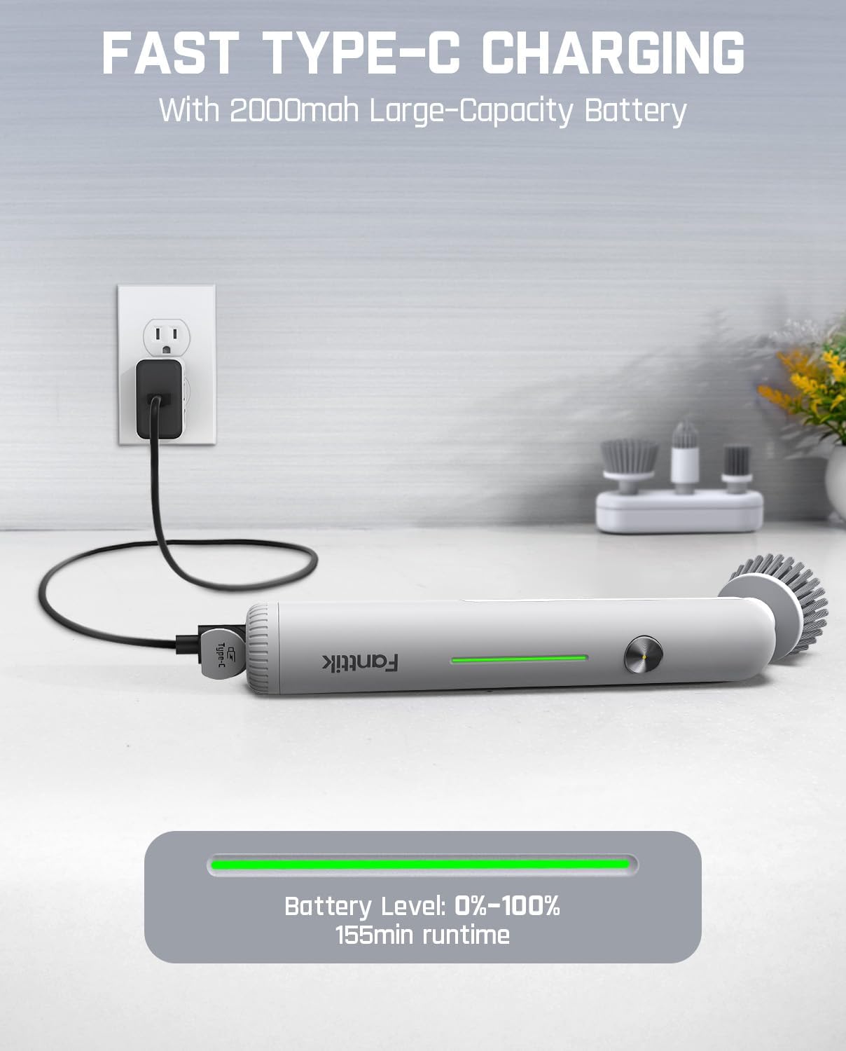 - Battery-free & Lasting Power: The Fanttik G9 Nano power scrubber is equipped with a 2000 mAh rechargeable battery, which provides up to 155 minutes of continuous use. Enjoy convenience and eco-friendliness. The LED power bar displays the battery level and charging status in real time, allowing you to keep track of it at all times