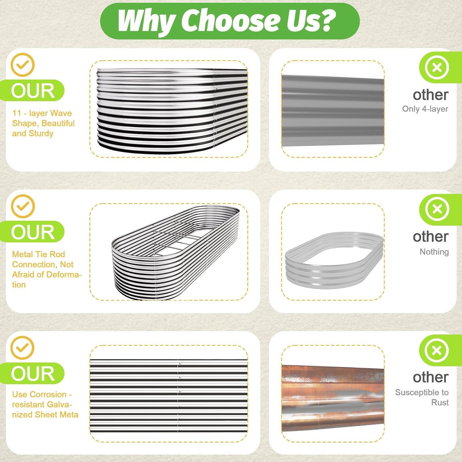 - More spacious planting space: At a 16-inch depth the extra height provides ample space for root development, better drainage, and improved soil quality. It also reduces the strain of bending over, as gardening in raised beds means you donβt have to stoop as far while tending, weeding, or harvesting your plants, making the process more comfortable and convenient.