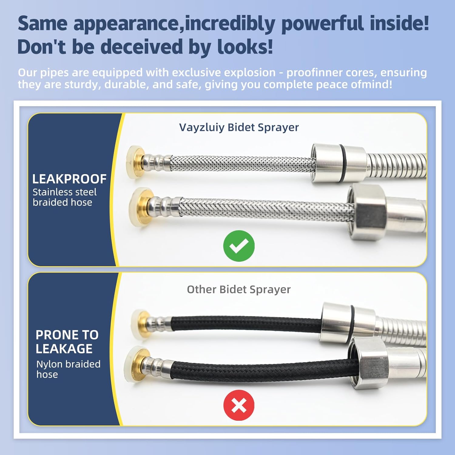 - High-Quality Craftsmanship - Elevate your hygiene with the Vayzluiy Handheld Bidet Sprayer. Crafted with precision, featuring a solid brass valve body, a 304 stainless steel sprayer, and leak-proof stainless steel braided hose, this product ensures years of reliable use.