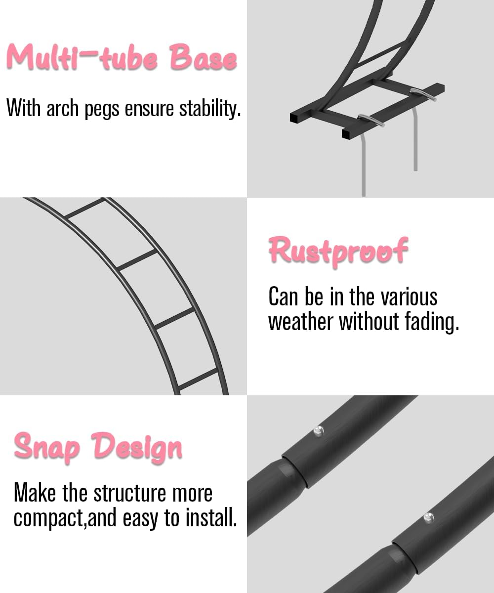 - Double-Tubes Construction: This garden arch features a robust double-tube structure with a sturdy base, ensuring exceptional stability and balance. The snap design contributes to a more compact and durable construction, making it suitable for both indoor and outdoor applications.