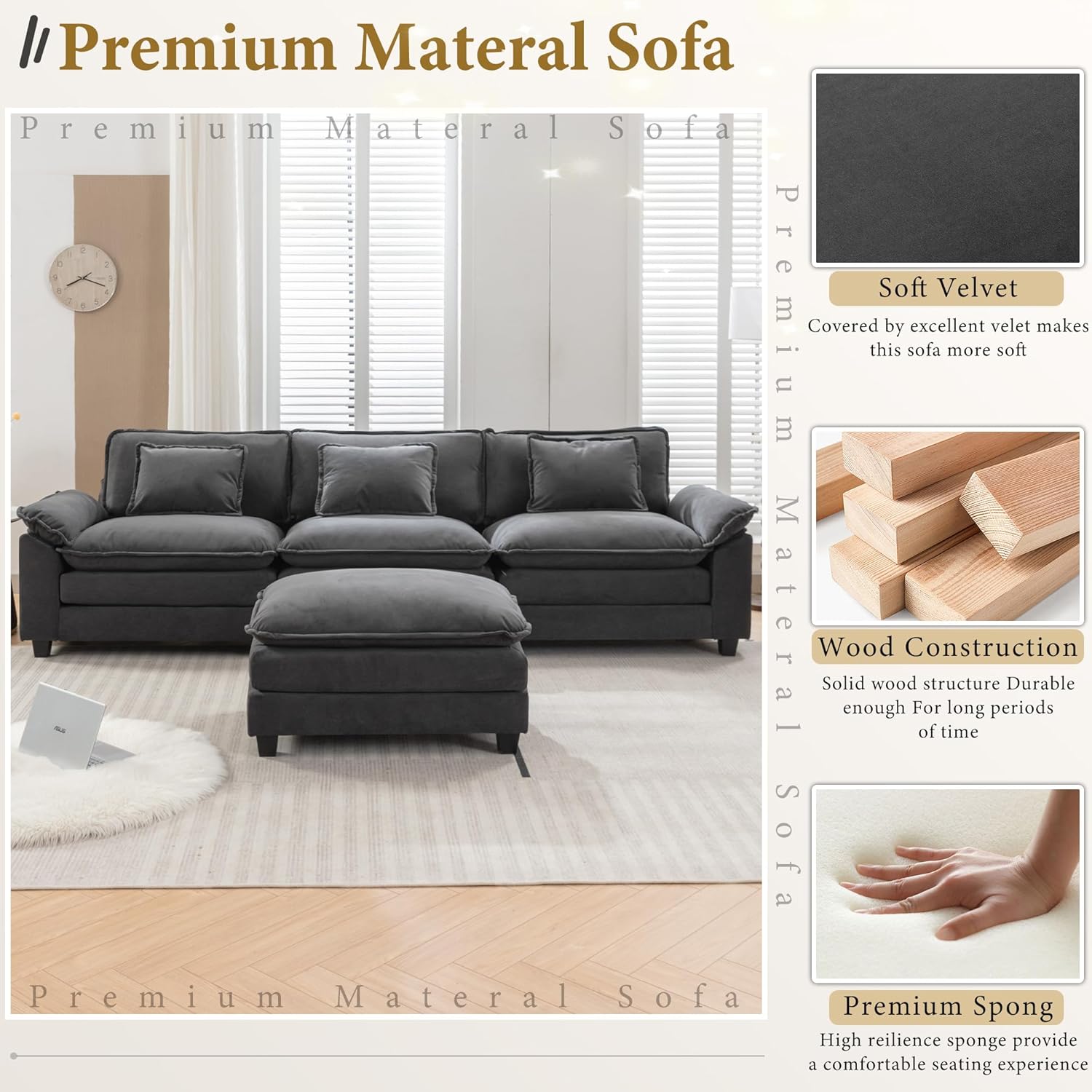 URRED Modular Sectional Sofa Comfy Cloud Couch, Modern Velvet Sofa Sleeper Deep Seat Couches with Ottoman/Pillows for Living Room (Dark Gray, 117''- L Shape)