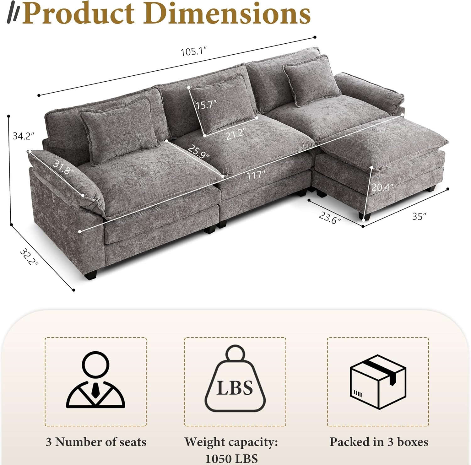 URRED Modular Sectional Sofa Comfy Cloud Couch, Modern Chenille Sofa Sleeper Deep Seat Couches with Ottoman/Pillows for Living Room (Gray, 117''- L Shape)