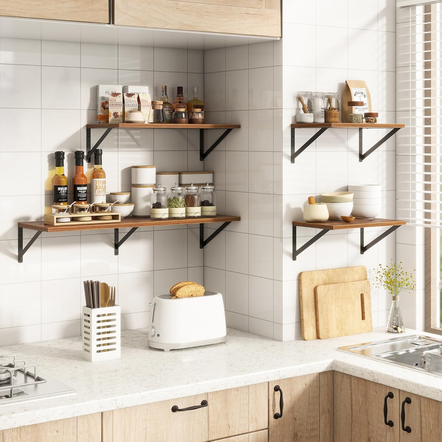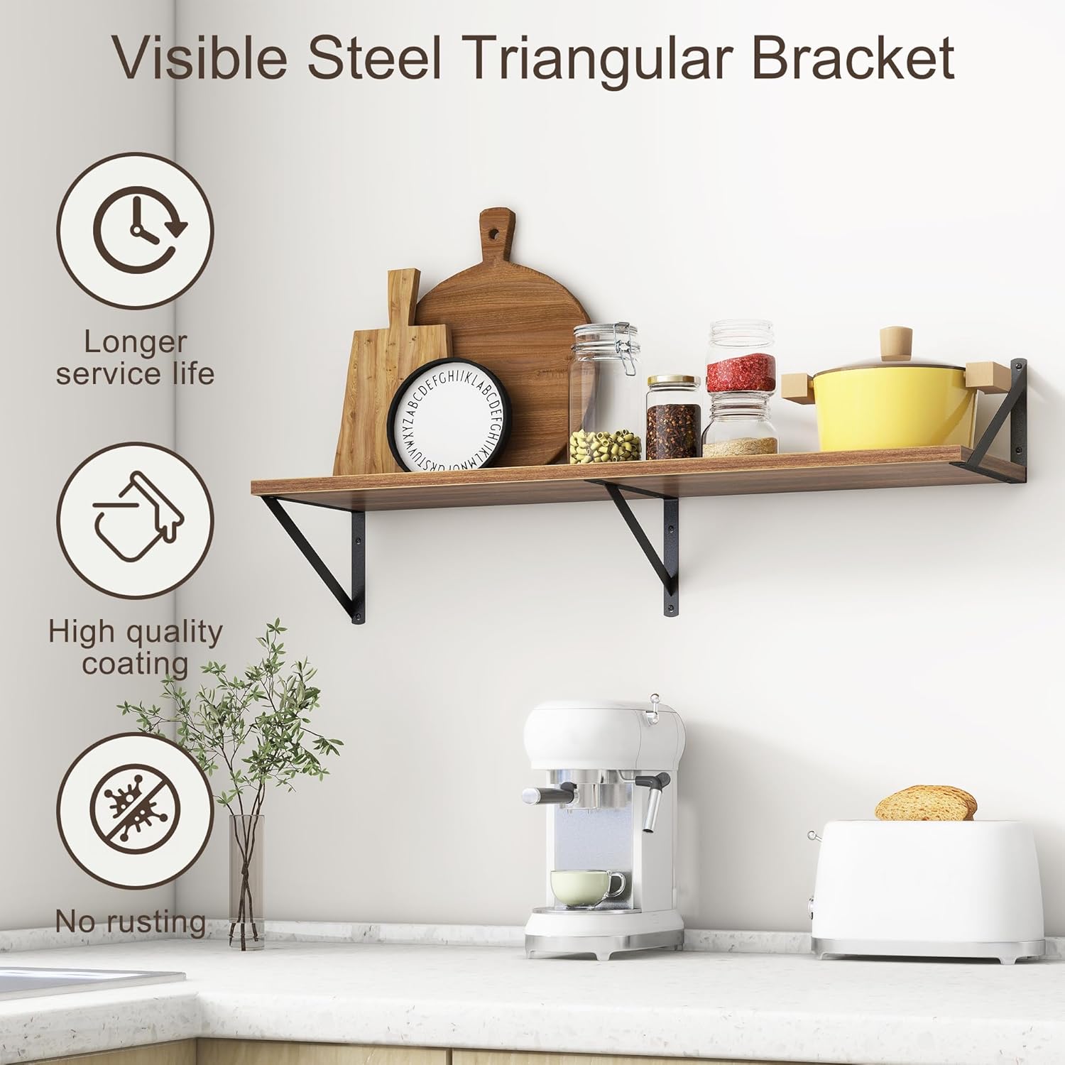 - γFARMHOUSE RUSTIC WALL SHELFγThese floating shelves are made of premium engineered wood board and visible triangular bracket. The rustic wooden grain surface add character and warmth to any modern or traditional interior with these deep floating shelves, contrast shelves at staggering heights on the wall or mount side-by-side or in the corner for a clean streamlined look.