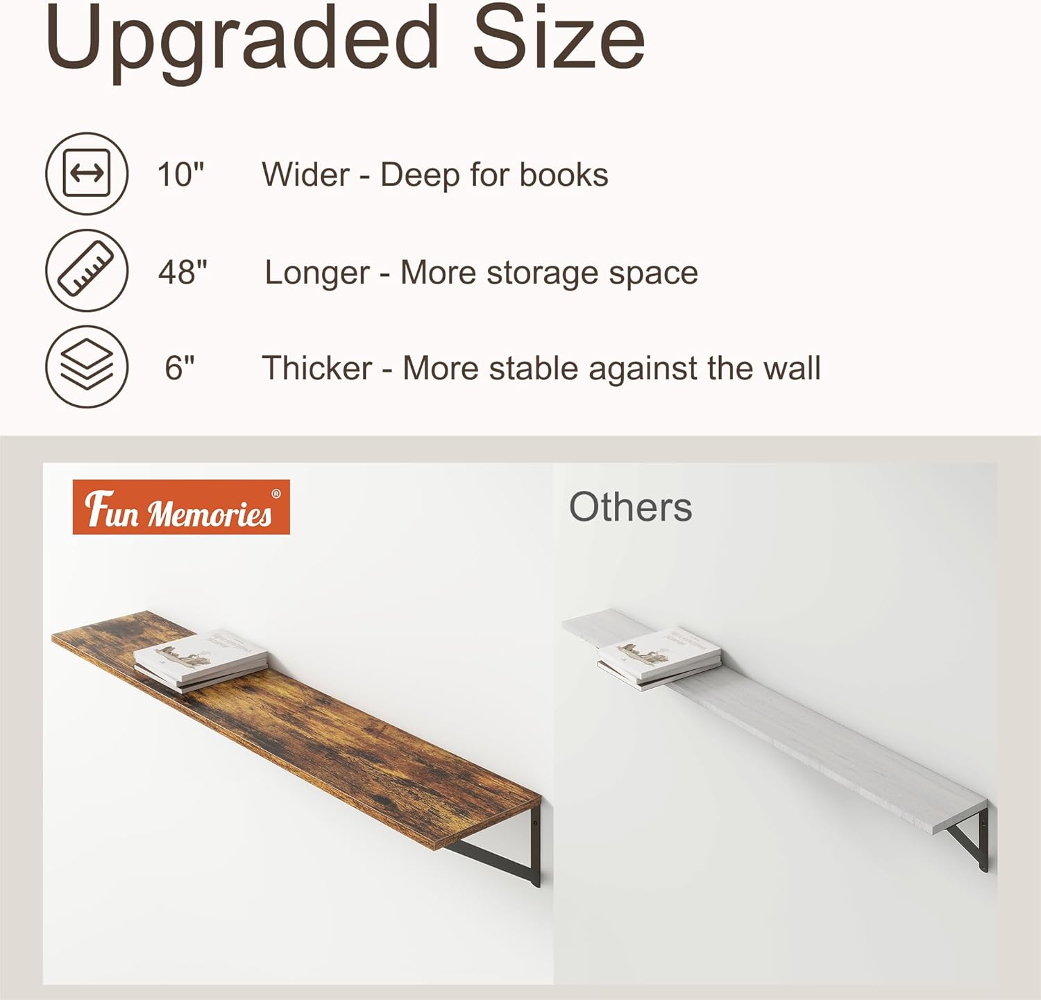 - 【10 INCH DEEP FLOATING SHELF】This extra deeper and wider wall shelves are 10 inches in depth and 48 inches in length instead of the regular narrow floating shelves, you can put photos, pictures, DVD players, videos, books, toys, and some other knickknack on this beautiful display wooden shelf.