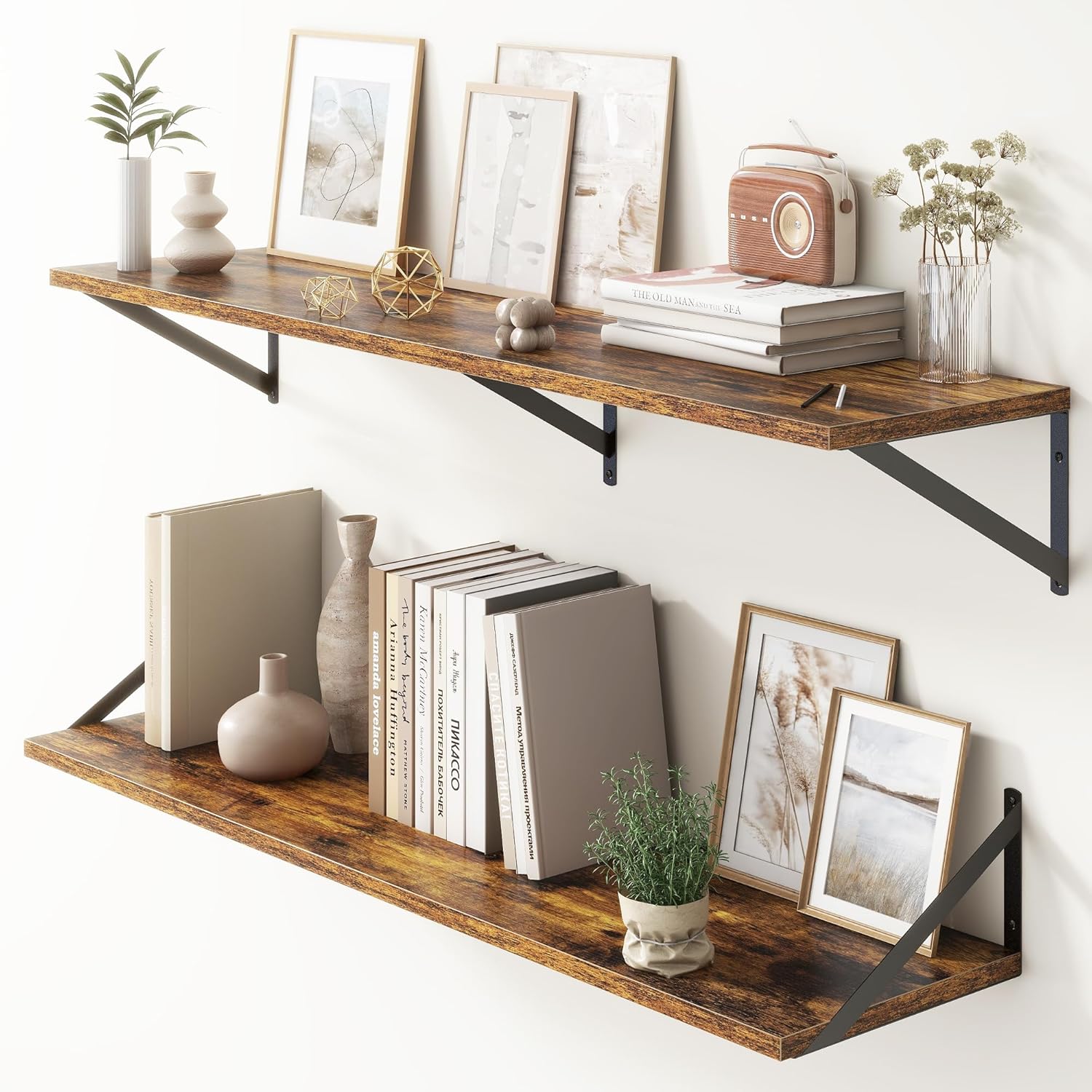 - 【FARMHOUSE RUSTIC WALL SHELF】These floating shelves are made of premium engineered wood board and visible triangular bracket. The rustic wooden grain surface add character and warmth to any modern or traditional interior with these deep floating shelves, contrast shelves at staggering heights on the wall or mount side-by-side or in the corner for a clean streamlined look.