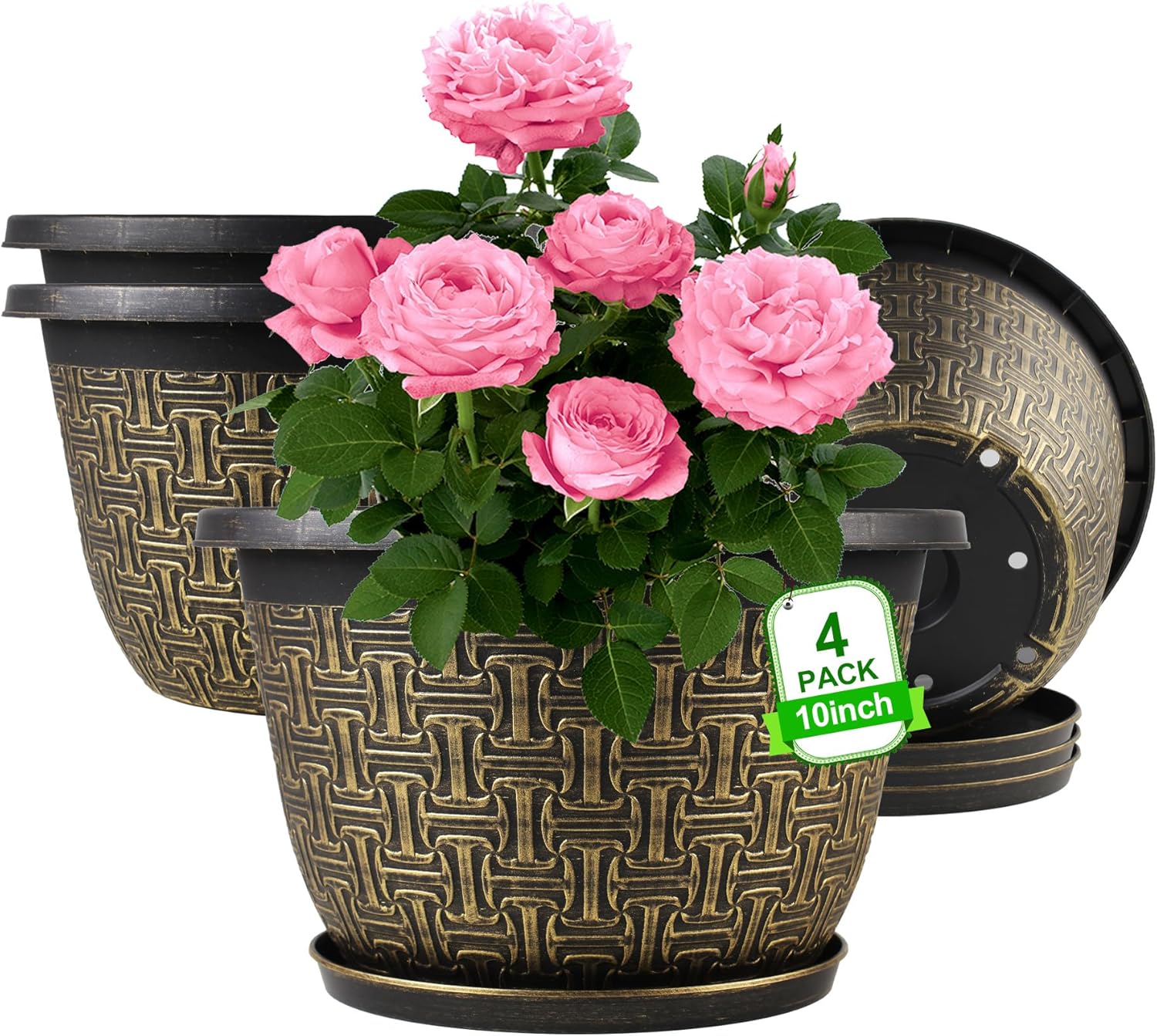 10 Inch Plant Pots, 4 Pack Flower Pots Outdoor with Drainage Holes & Trays, Retro Antique Imitation Decorative Garden Plastic Pots for Plants Indoor Sets for Houseplants