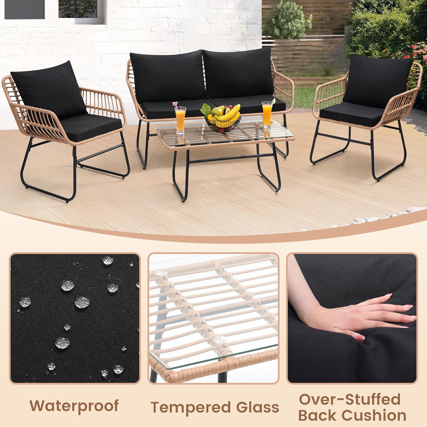 - 【Easy Assembly & Maintenance】 Our 4 piece patio furniture set is designed for hassle-free setup, with clear instructions that make assembly a breeze. The low-maintenance design features weather-resistant wood and removable cushion covers, ensuring that your set stays pristine with minimal effort, leaving you more time to enjoy your outdoor oasis.