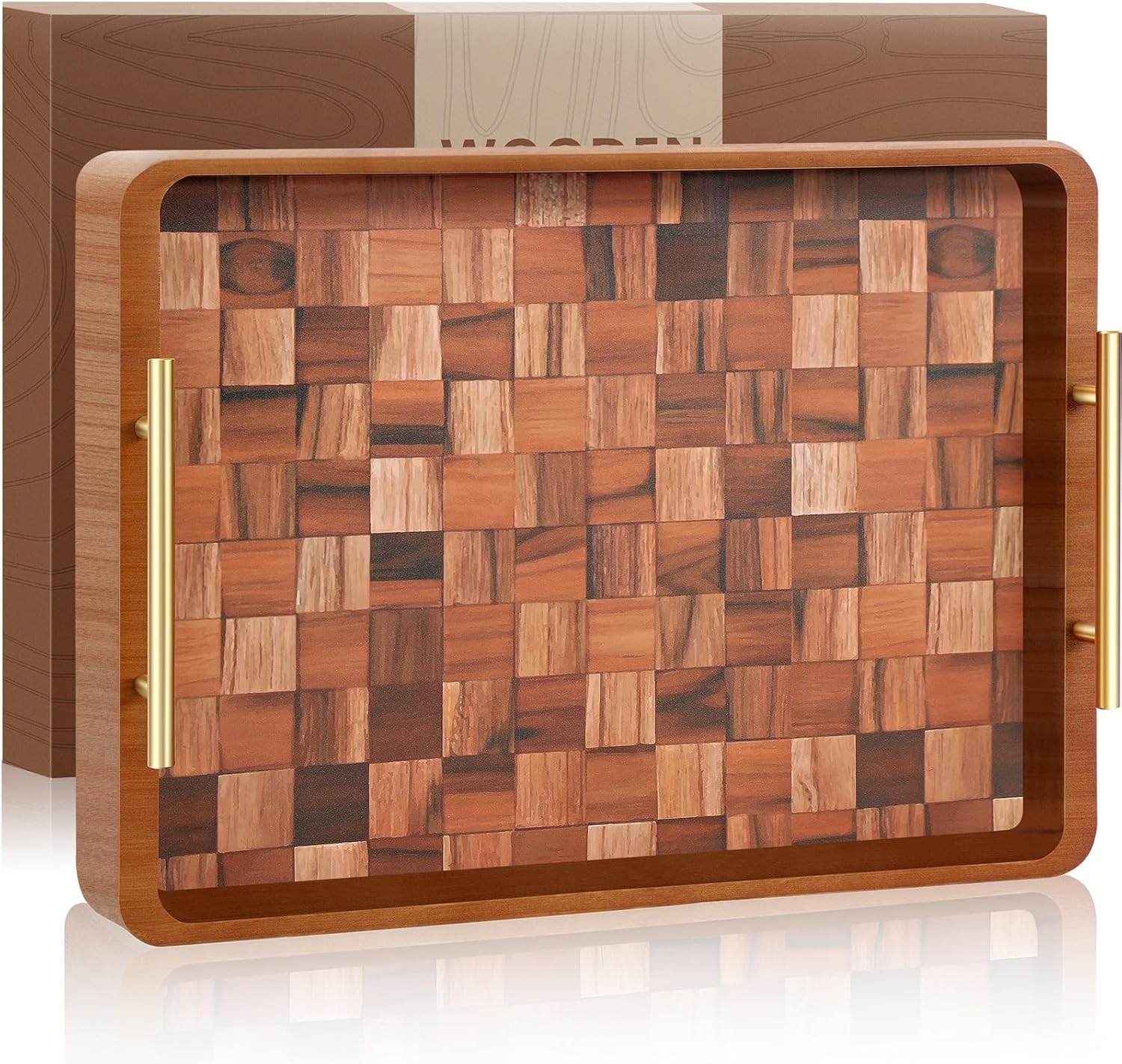 Wooden Serving Tray with Handles Mat, Decorative Coffee Table Trays, Wood Ottoman Tray for Serving Food Drink Breakfast Dinner,1 Pcs