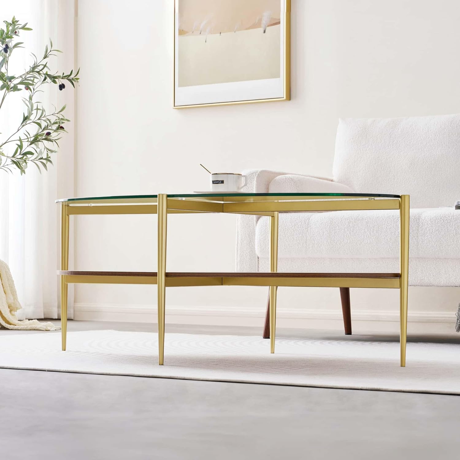 Oval Glass Coffee Table, Mid-Century Modern Design, L43 x W22 x H17 inch, 2-Tier Structure, Olive Shaped Clear Glass Top and Walnut Finish Wood Shelf, Tapered Legs with Gold Finish Frame