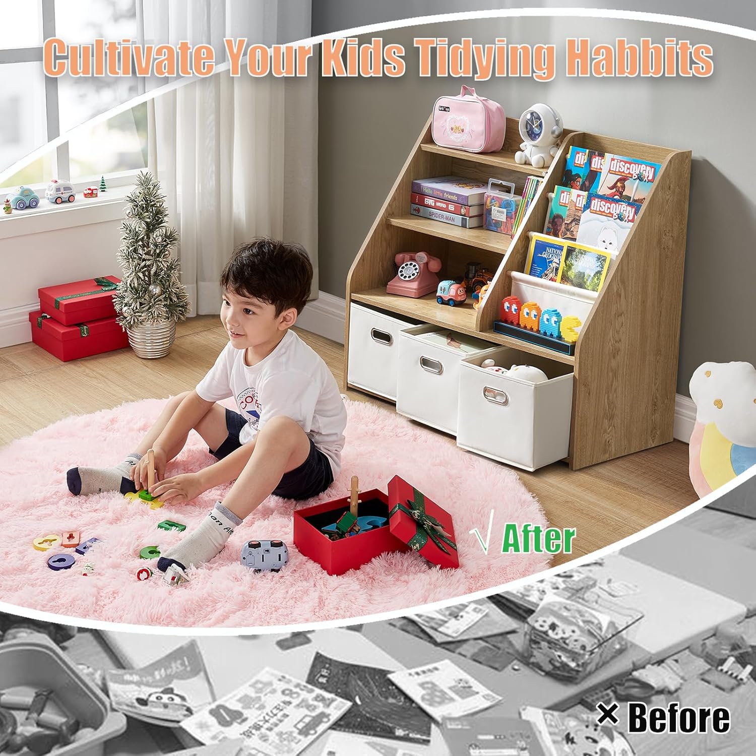 - โญ๏ธ [Quick Assembly & Versatile Placement] Comes with all tools and a clear manual for easy setup. Whether itโs in the kids' room, playroom, nursery, classroom, or reading corner, this bookshelf with toy bins helps keep your childโs space neat and tidy โ and itโs easy to wipe clean.