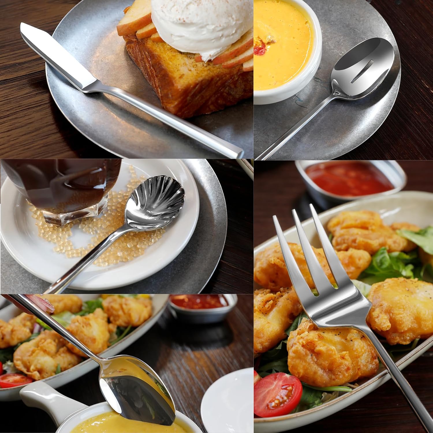 - 【45-PIECE SET】Includes 8 dinner knives, 8 dinner forks, 8 dinner spoons, 8 salad forks and 8 teaspoons; contain matching 5-piece serving set, 1 serving spoon, 1 serving fork, 1 slotted serving spoon, 1 butter knife and 1 sugar spoon, service for 8.