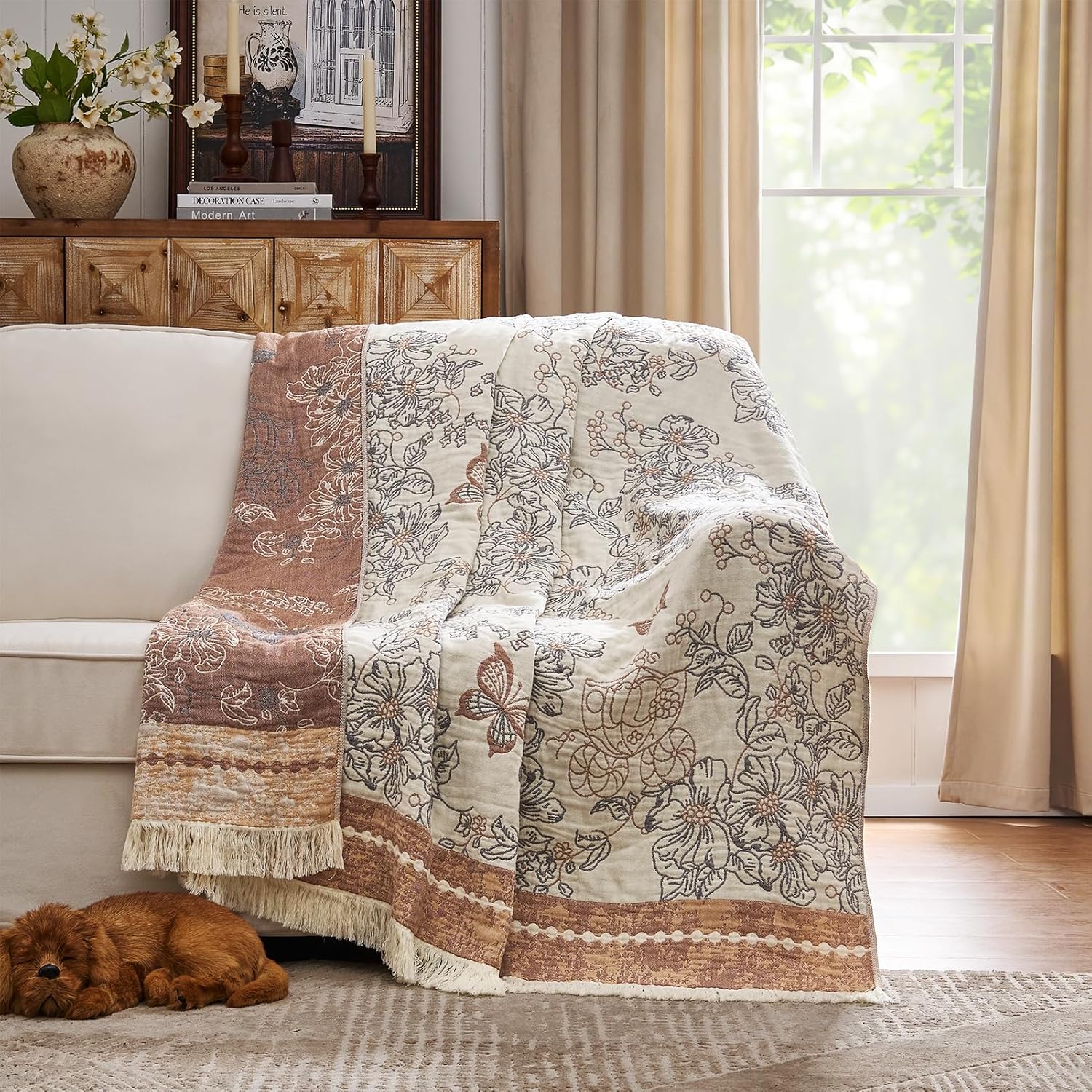 - Elegant Floral Design:This 60x80 blanket features a delicate floral pattern in soft shades of taupe and white. Delicate flowers and butterflies adorn it, bringing a touch of nature's beauty to your space. The fringed border adds a rustic charm