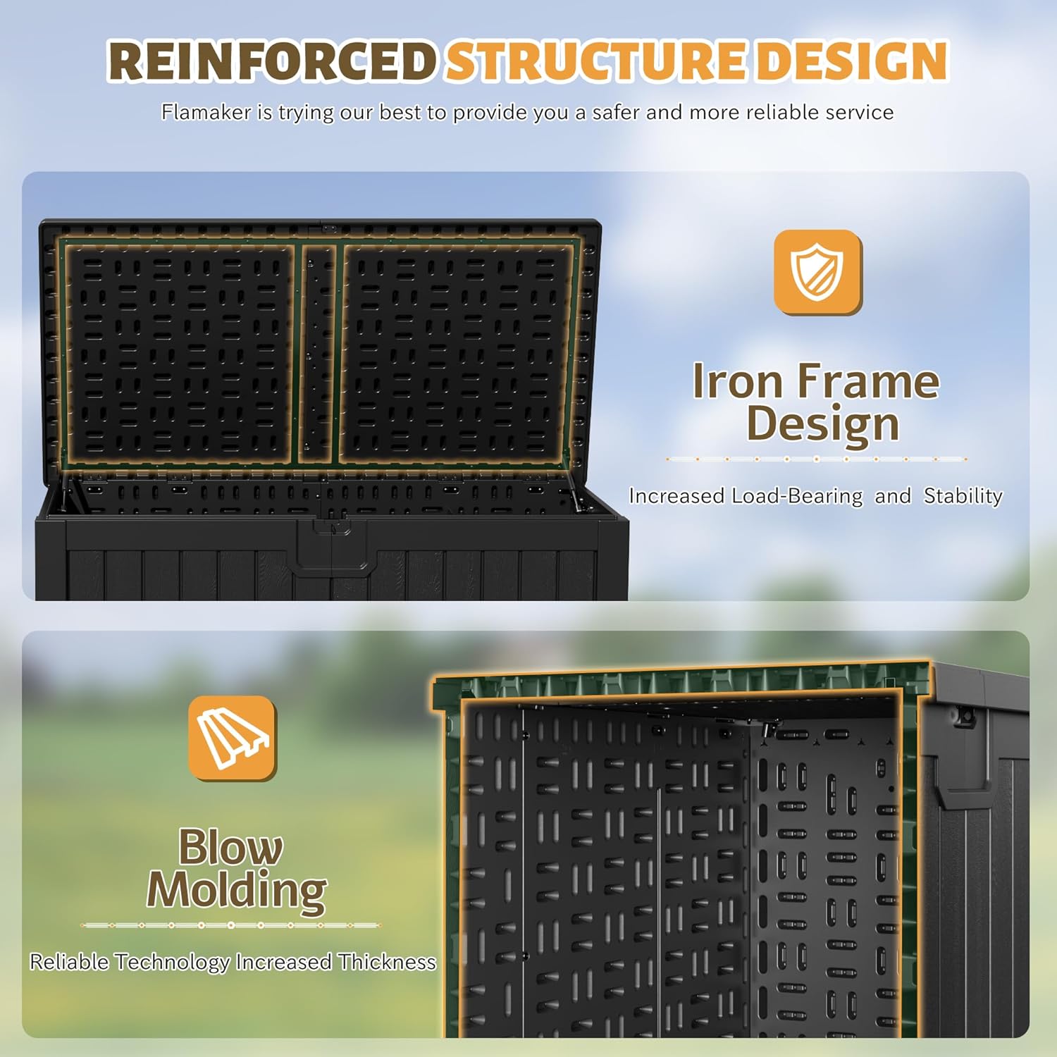 - [As a Seat] Flamaker’s large outdoor storage deck box, not only guarantees the storage capacity, but can be used as a seat, which can be used by up to 2 people