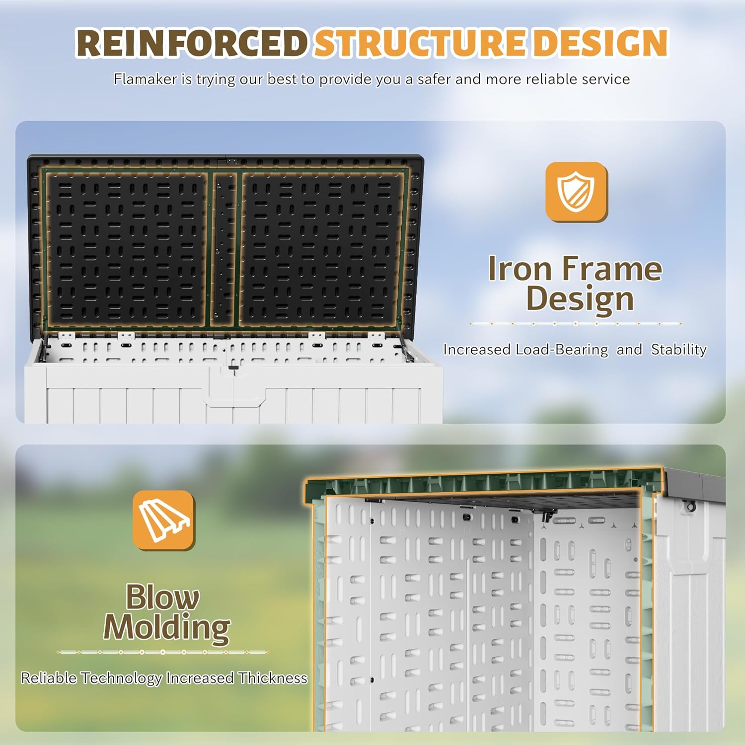- [As a Seat] Flamaker’s large outdoor storage deck box, not only guarantees the storage capacity, but can be used as a seat, which can be used by up to 2 people