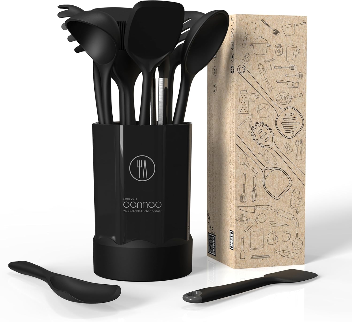 Thickened Silicone Kitchen Utensils Set, 600°F Heat Resistant Silicone Cooking Utensils, Spatula, Spoon, Whisk, Tongs, Kitchen Gadgets Sets for Nonstick Cookware, Dishwasher Safe BPA Free (Black)