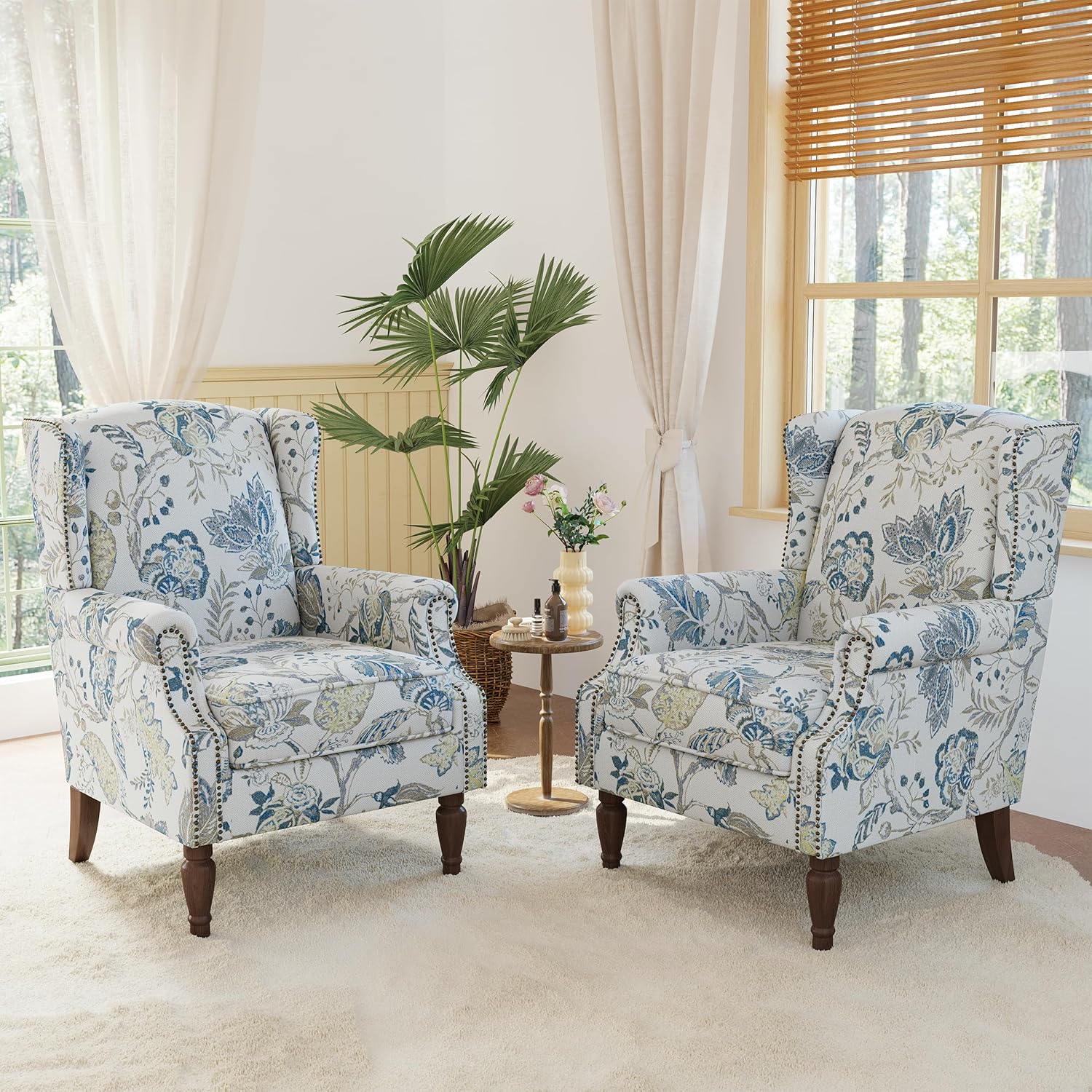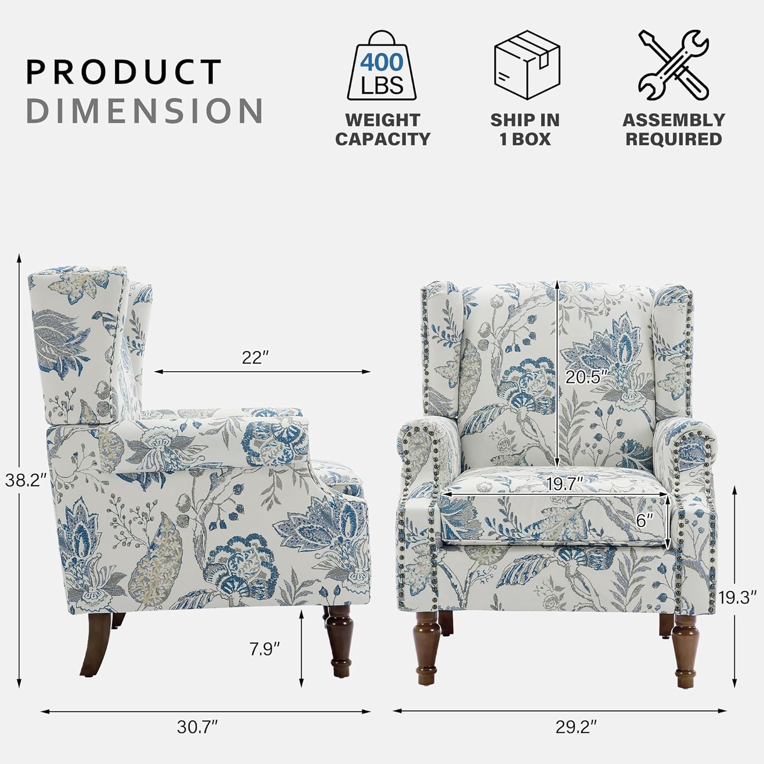 Lumibee Wingback Accent Chair, 2 Set High Back Floral Armchairs in Fabric,Comfy Upholstered Reading Single Sofa Chairs with Solid Wood Legs for Living Room,Bedroom,Office-Plants Blue