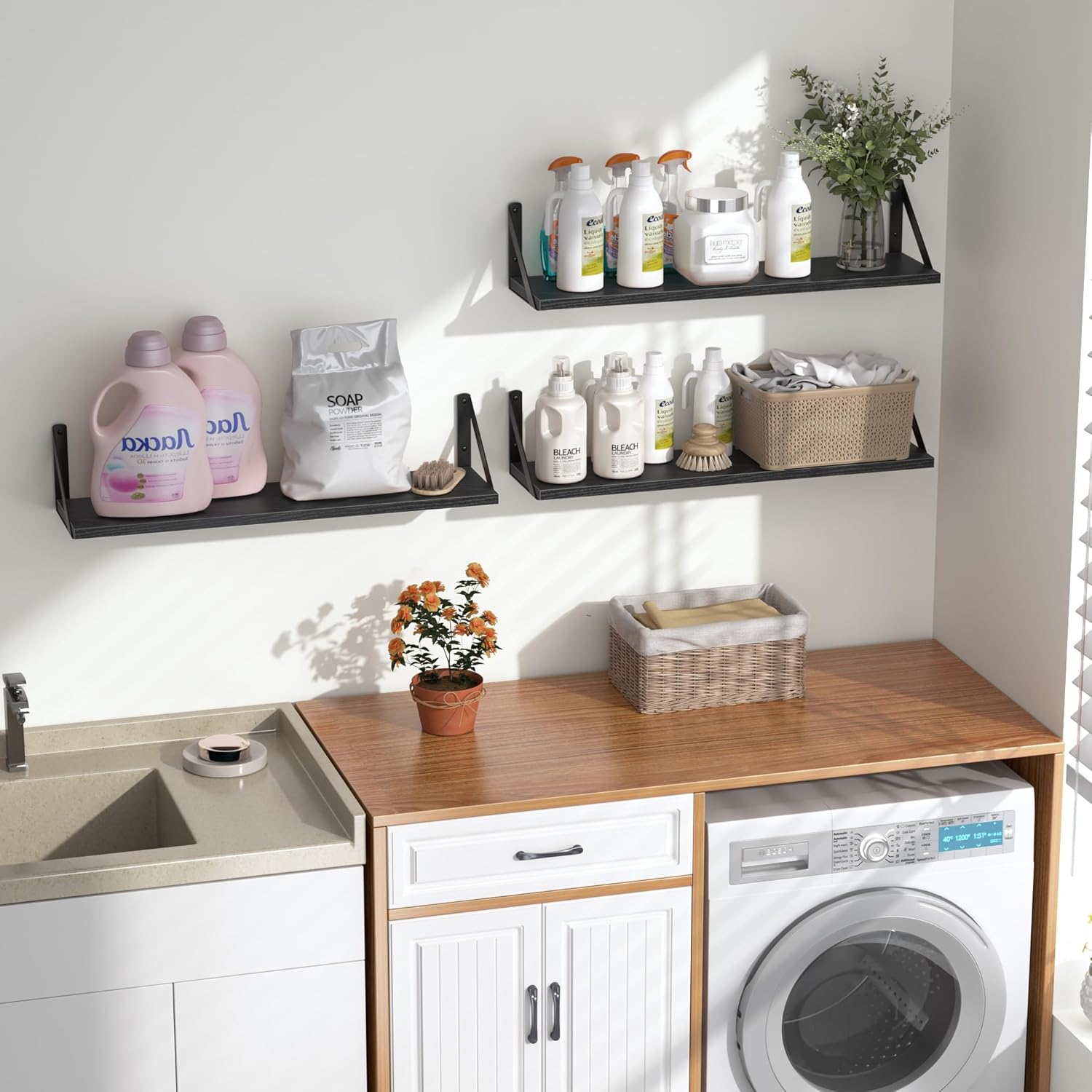 - 【MULTIFUNCTIONAL WALL SHELF】The floating shelves can turn a small area into an organized space, providing storage space for bedroom, bathroom, kitchen, easily placing greenery, books, crafts, spice jars, toiletries