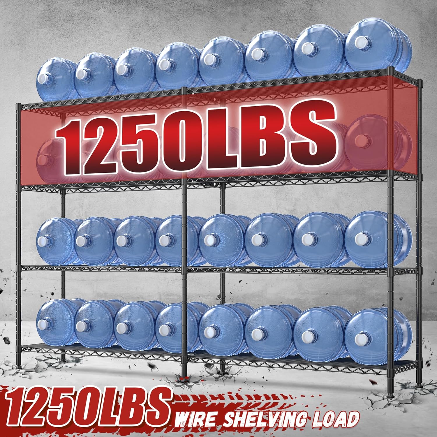 - γ1250 LBS Capacity Super Sturdy Storage Shelving Storage RackγThis Metal shelves for storage made of heavy duty steel wire,and has undergone special coating treatment.Every solid thickened shelving with extra stiffener,can easily bear 250LBS a total of 1250 lbs bearing capacity .which means this metal shelving unit will always be your reliable partner.