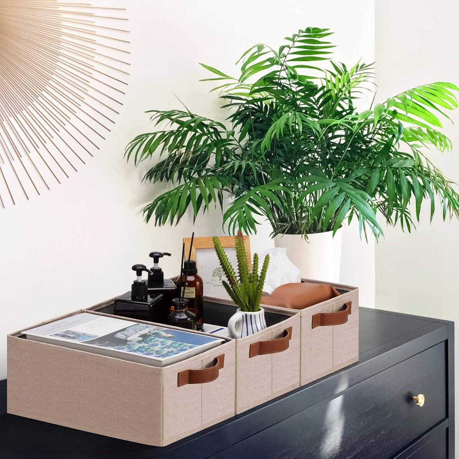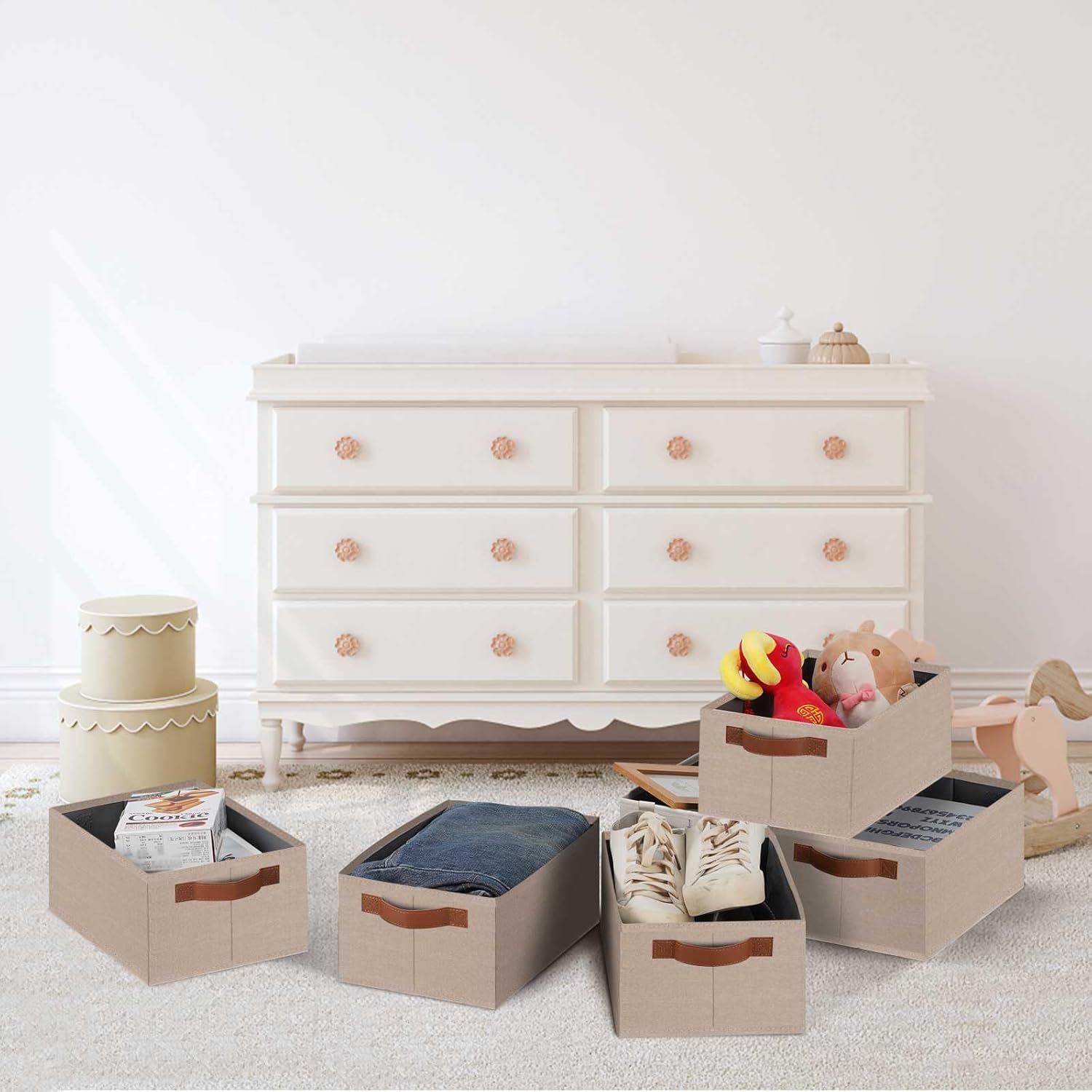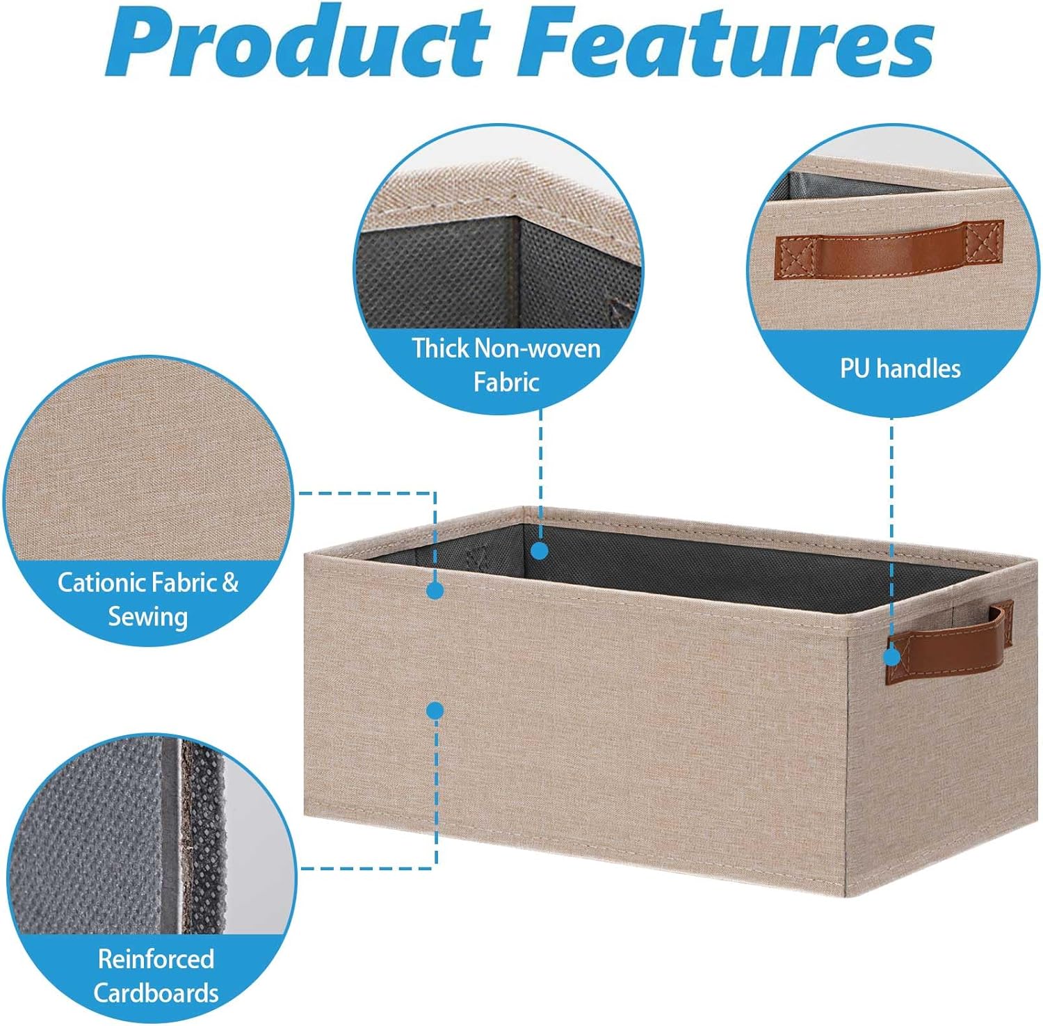 - 👍【QUALITY MATERIAL】Storage baskets for shelves are made of high-quality cationic fabric and polyester cotton fabric, and the inner layer is made of non-woven fabric, which is odorless, long-lasting and strong. Classic faux leather handles that adds a comfortable touch and provides a strong and comfort grip to pull and move. Fabric storage bin is easy to clean, just wipe with a damp sponge or cloth.
