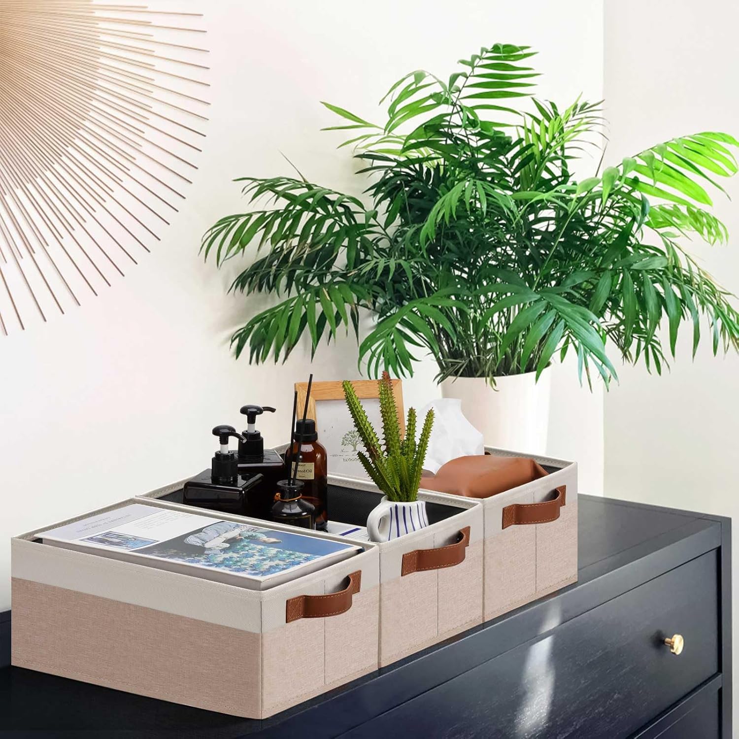 - 👍【QUALITY MATERIAL】Storage baskets for shelves are made of high-quality cationic fabric and polyester cotton fabric, and the inner layer is made of non-woven fabric, which is odorless, long-lasting and strong. Classic faux leather handles that adds a comfortable touch and provides a strong and comfort grip to pull and move. Fabric storage bin is easy to clean, just wipe with a damp sponge or cloth.