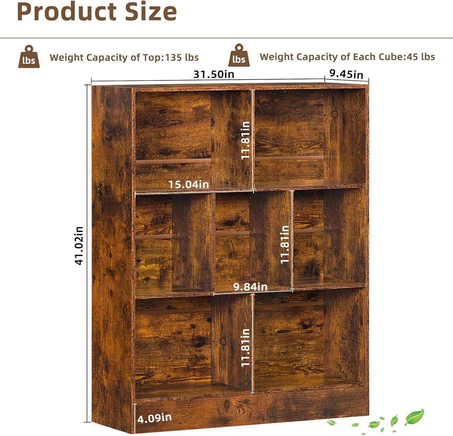 LEYAOYAO 7 Cube Bookshelf with Wood Base, Brown 3 Tier Mid-Century Modern Bookcase,Standing Wide Bookshelves Storage Organizer Shelf,Rustic Display Cabinet Book Shelves for Bedroom,Living Room,Office
